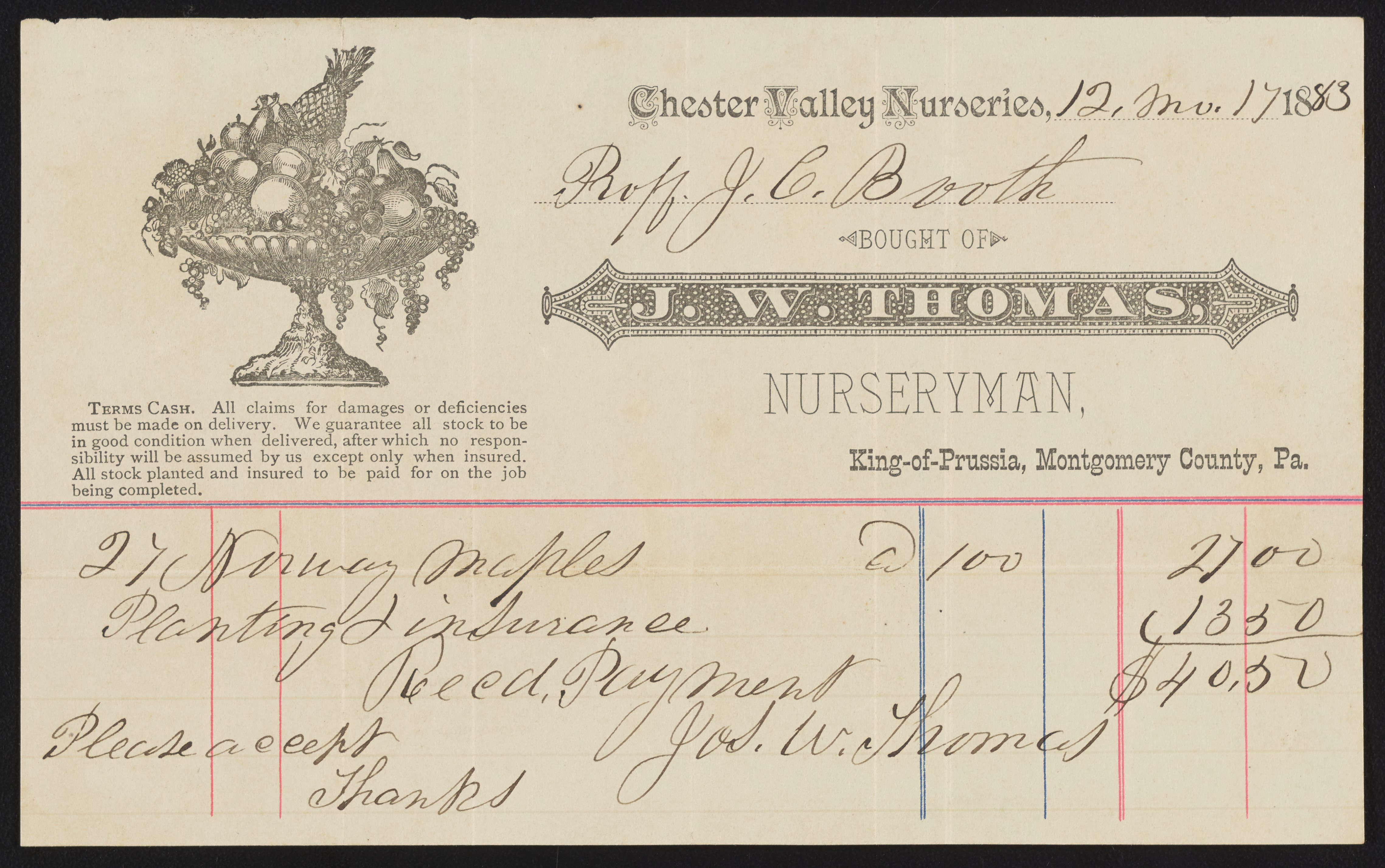Receipt from J.W. Thomas of Chester Vallery Nurseries
