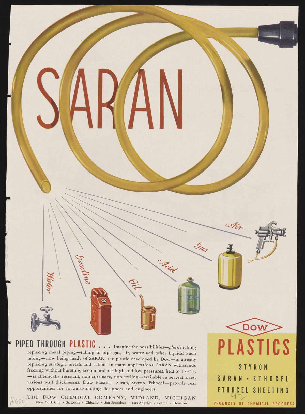 Dow Chemical Company. “Saran: Piped Through Plastic,” circa 1942. Advertisements from the Dow Chemical Historical Collection, Box 9. Science History Institute. Philadelphia. https://digital.sciencehistory.org/works/y8w3rzq.