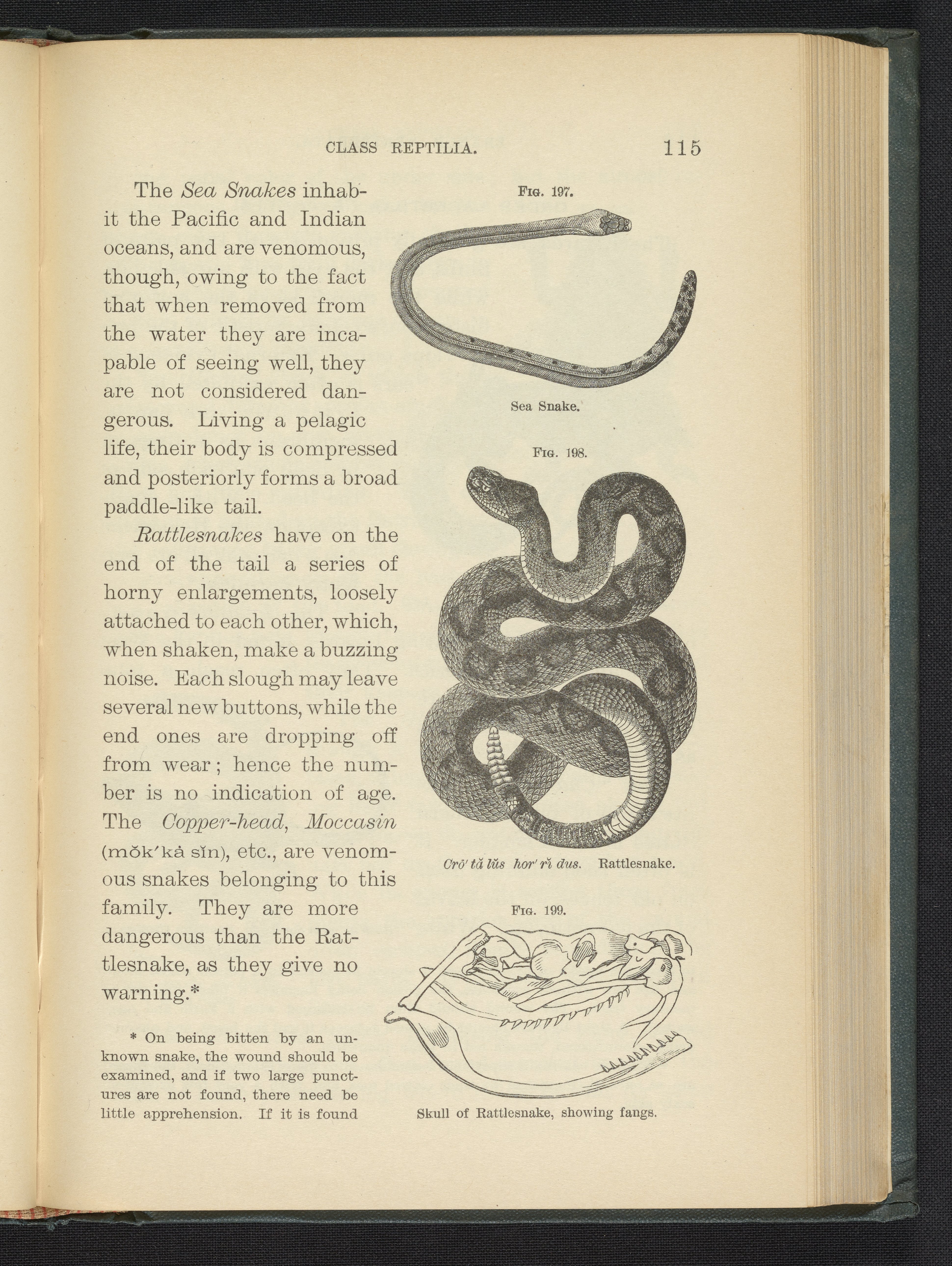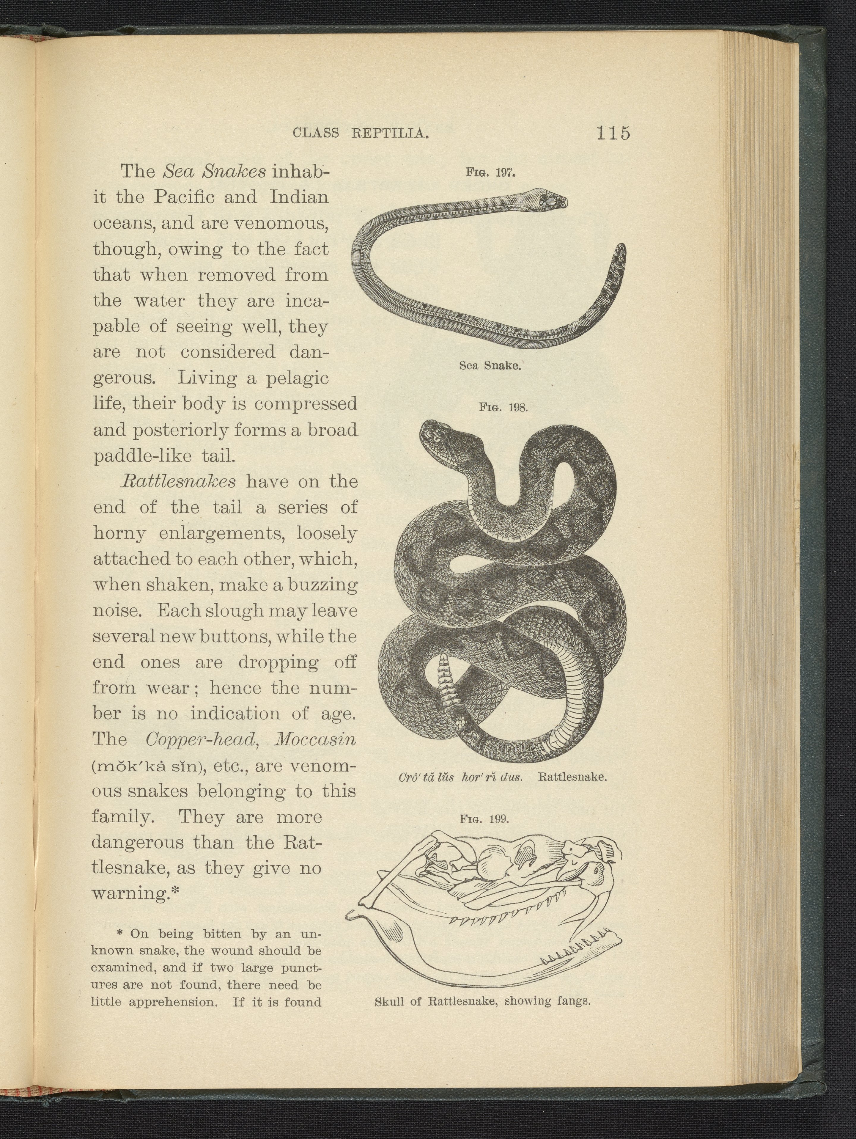 Figure 197. Sea Snake. Figure 198. Rattlesnake. Figure 199. Skull of Rattlesnake, Showing Fangs