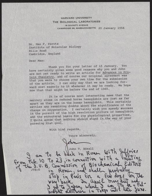 Edsall, John T. (John Tileston). “Letter from John T. Edsall to Max Perutz, January 20, 1964,” January 20, 1964. History of Molecular Biology Collection, Box 74, Folder 12. Science History Institute. Philadelphia. https://digital.sciencehistory.org/works/ybeitci.