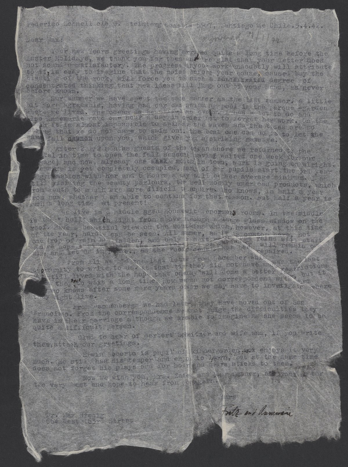 Federico and Annemarie Schnell write to their friend Max Bredig (1902-1977) to update him on their summer, jobs, child, and correspondence from friends abroad. Fritz writes that he last received a letter from his brother, Alfred (1900-1944), in December, and laments that he is unable to correspond further with him.