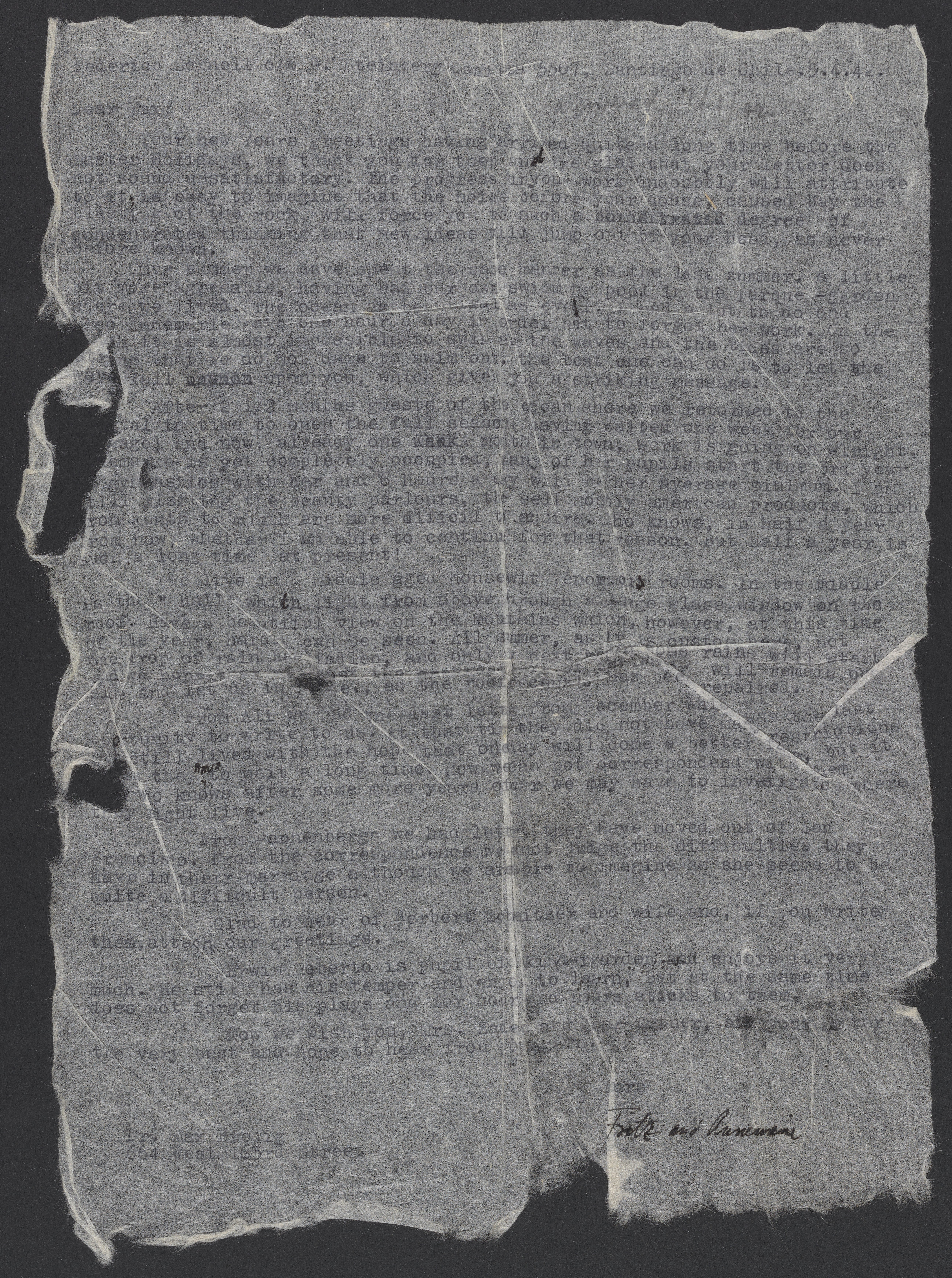 Federico Schnell c/o G. Steinberg Casilla 5507, Santiago de Chile.5.4.42.