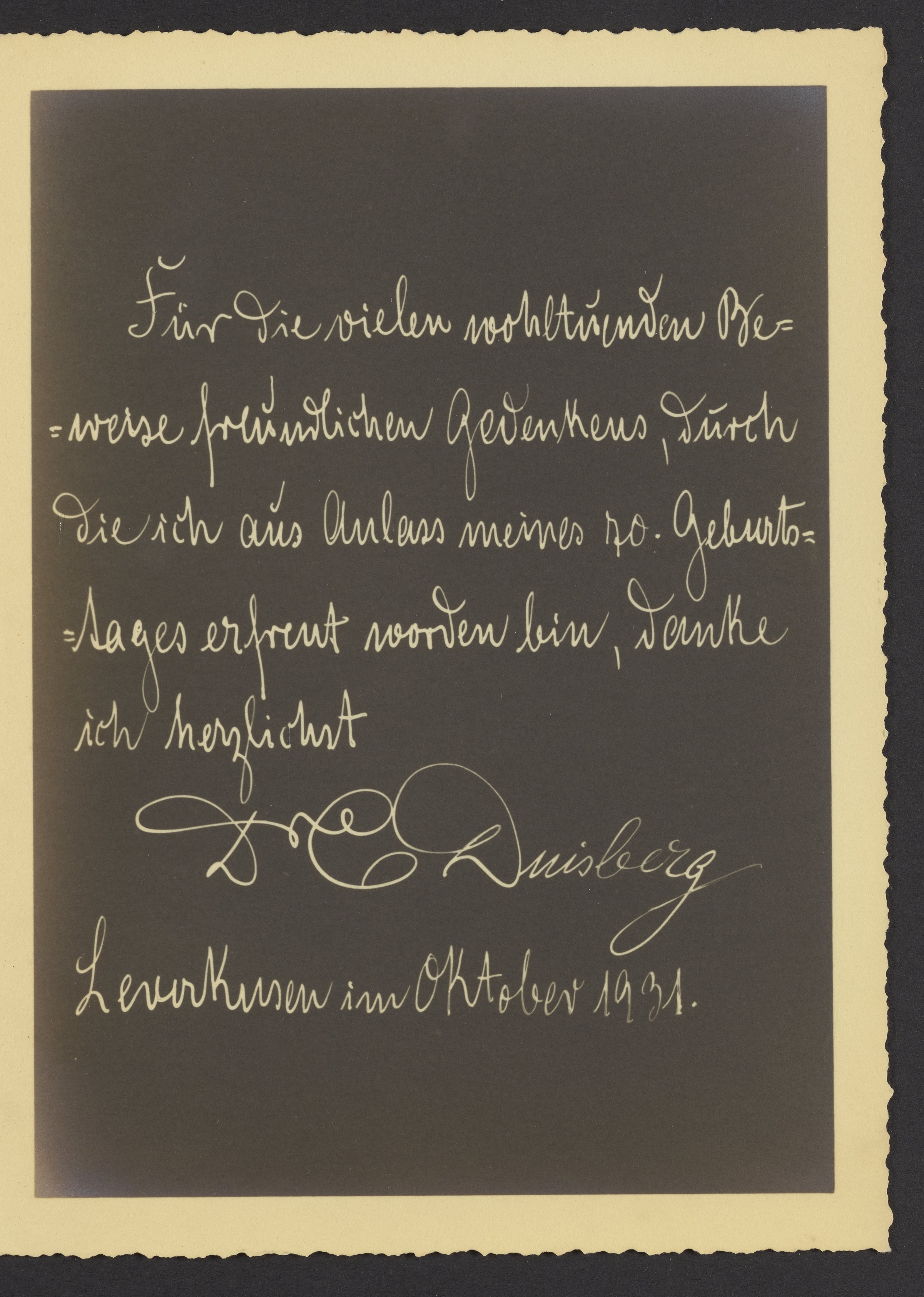 Small JPG1200 x 1596px — 159 KBLarge JPG2880 x 3831px — 1.1 MBFull-sized JPG3294 x 4382px — 1.5 MBOriginal fileTIFF — 3294 x 4382px — 41.4 MBCard with a portrait and thank you note from Carl Duisberg (1861-1935), in which Duisberg thanks his friends and family for wishing him well on his seventieth birthday. Duisburg was the CEO of Bayer AG from 1900 until 1912, when he became the Managing Director of the company. Duisburg later worked with Carl Bosch (1874-1940) to found I.G. Farbenindustrie AG.