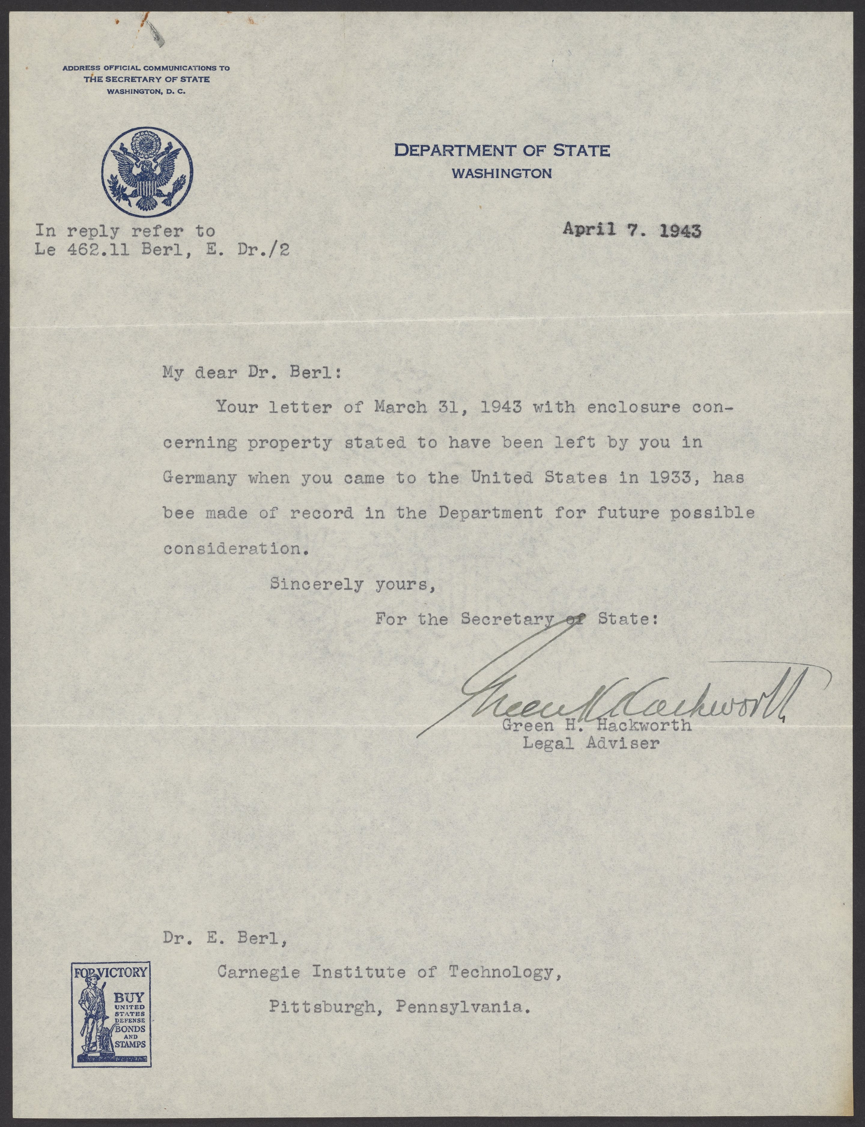 United States. Department of State, and Green Haywood Hackworth. “Letter from the United States Department of State to Ernst Berl, April 7, 1943,” April 7, 1943. Ernst Berl Papers, Box 2, Folder 46. Science History Institute. Philadelphia. https://digital.sciencehistory.org/works/yl6ssl9.