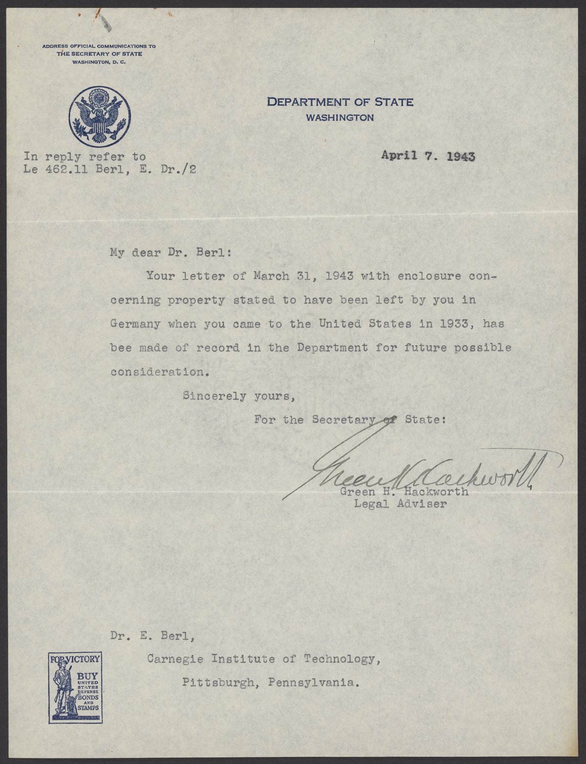 Letter from the United States Department of State to Ernst Berl, April 7, 1943