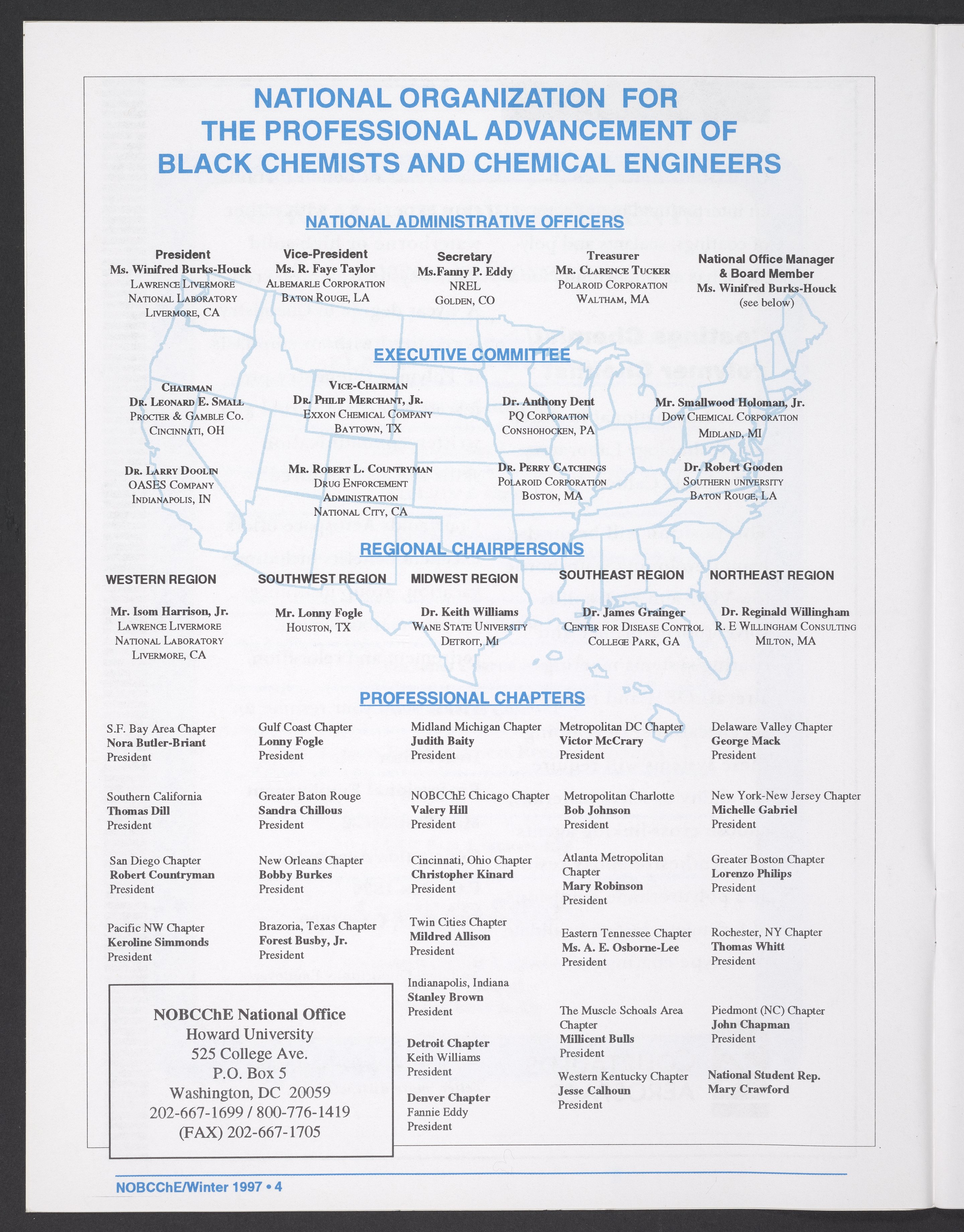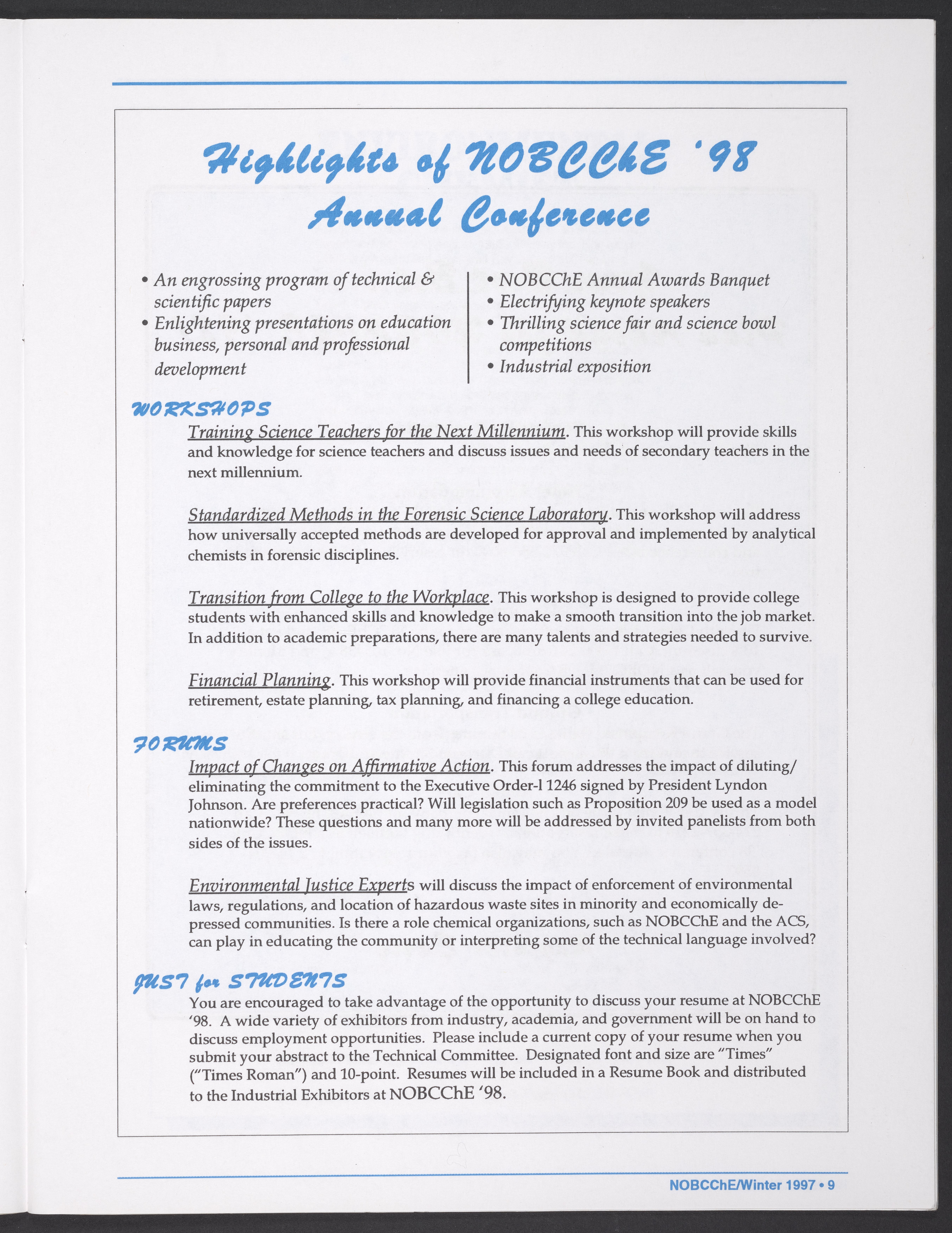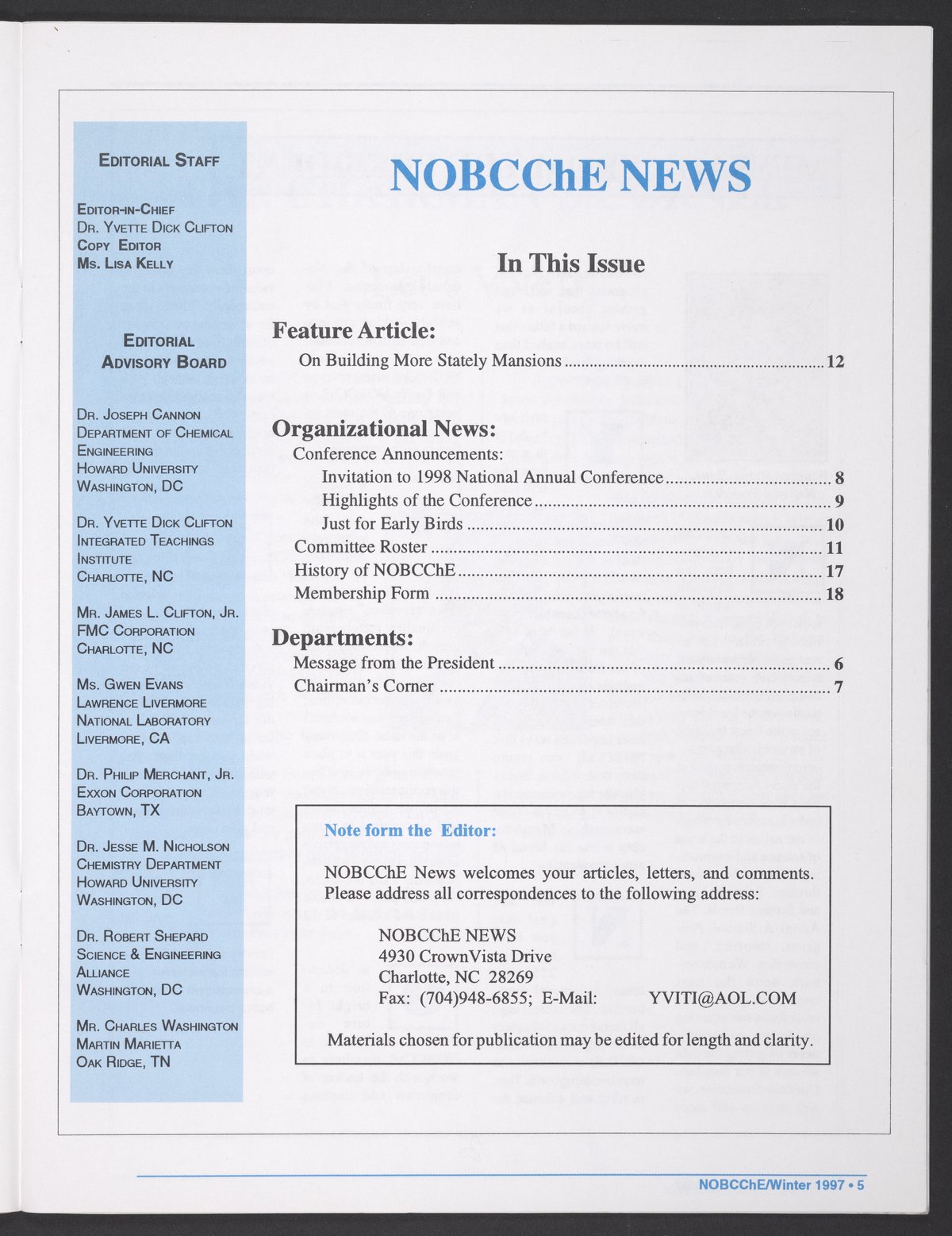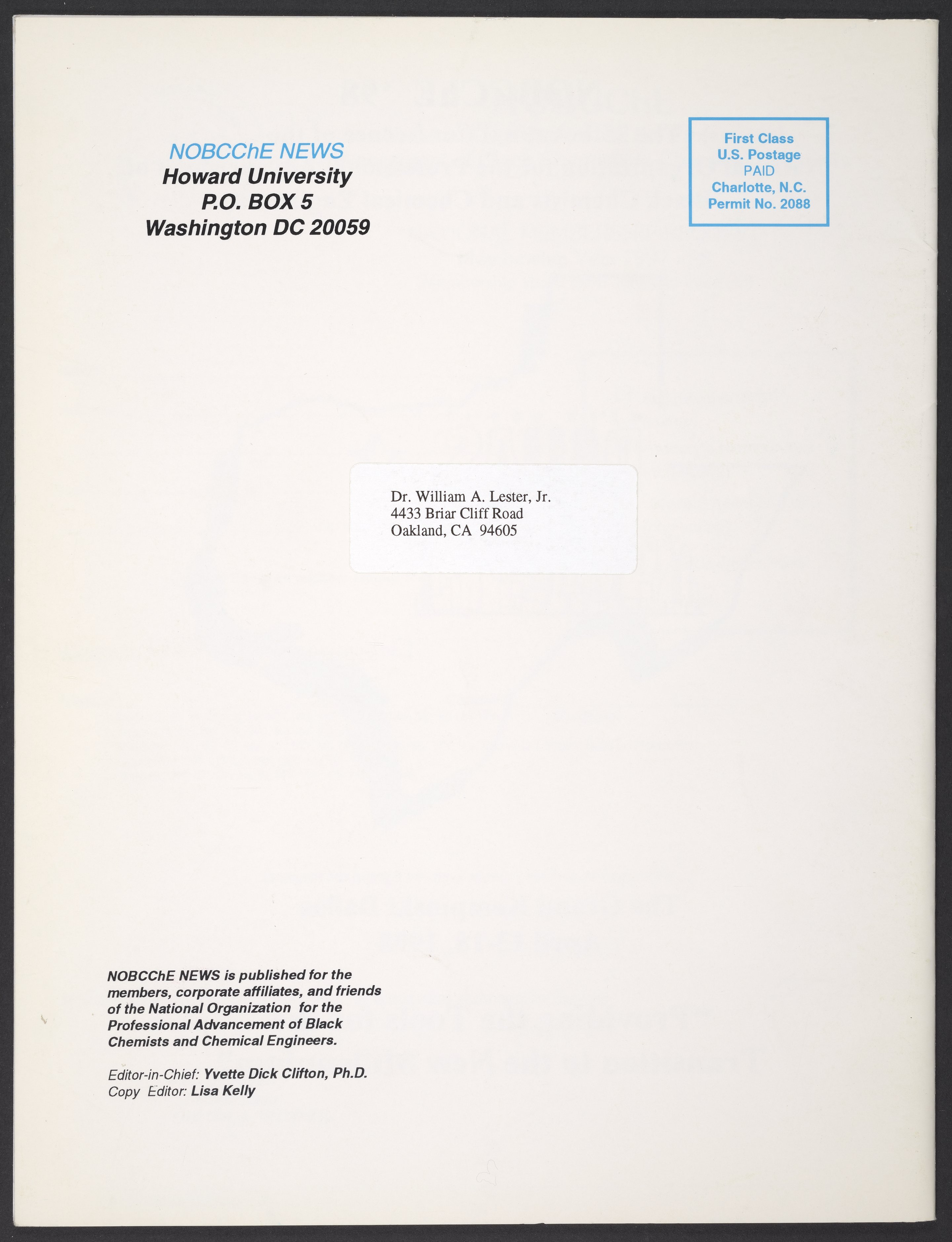 “NOBCChE News, Volume 18, Number 3.” National Organization for Black Chemists and Chemical Engineers, 1997. William A. Lester, Jr. Papers, Box 46, Folder 31. Science History Institute. Philadelphia. https://digital.sciencehistory.org/works/ylmgr6b.