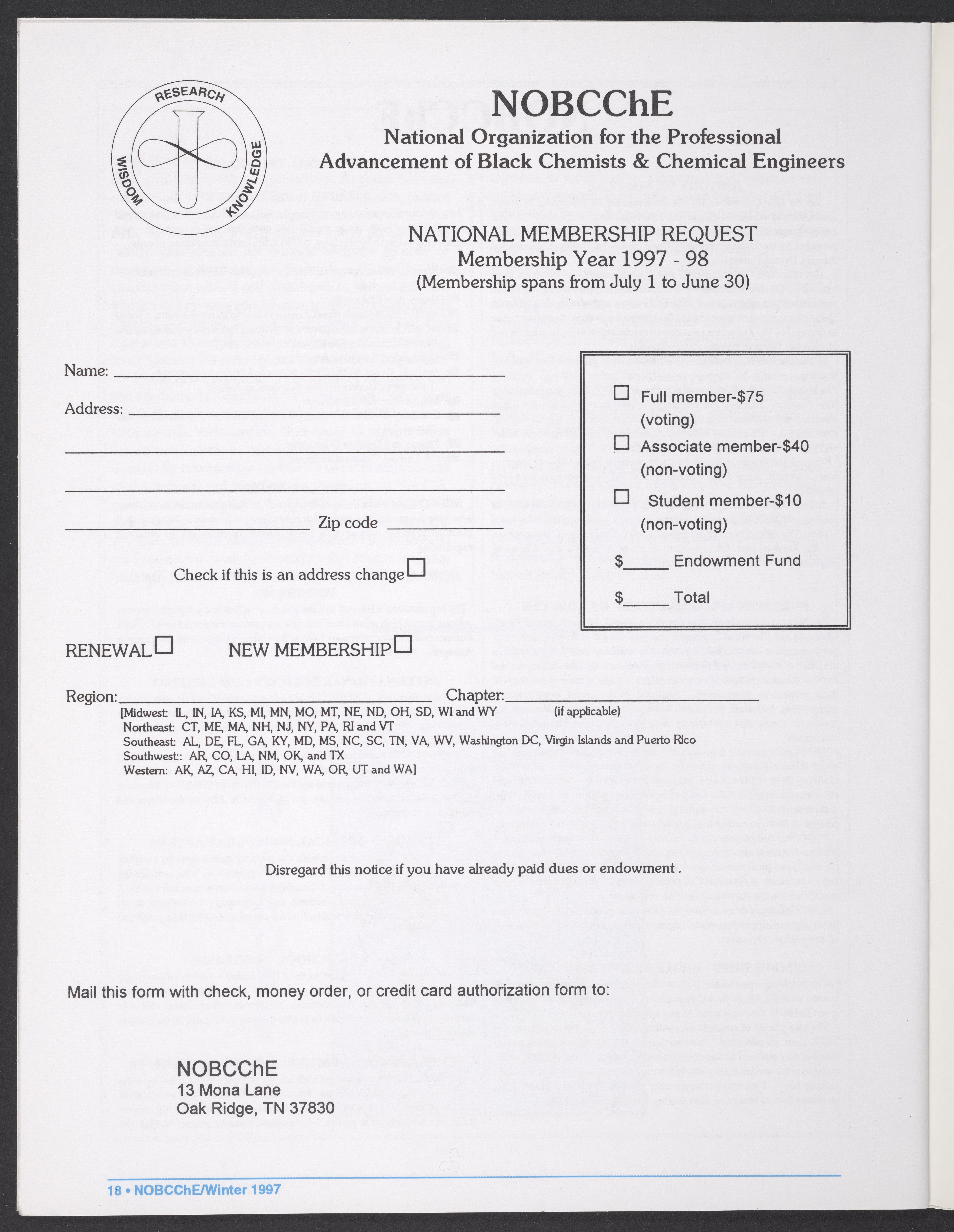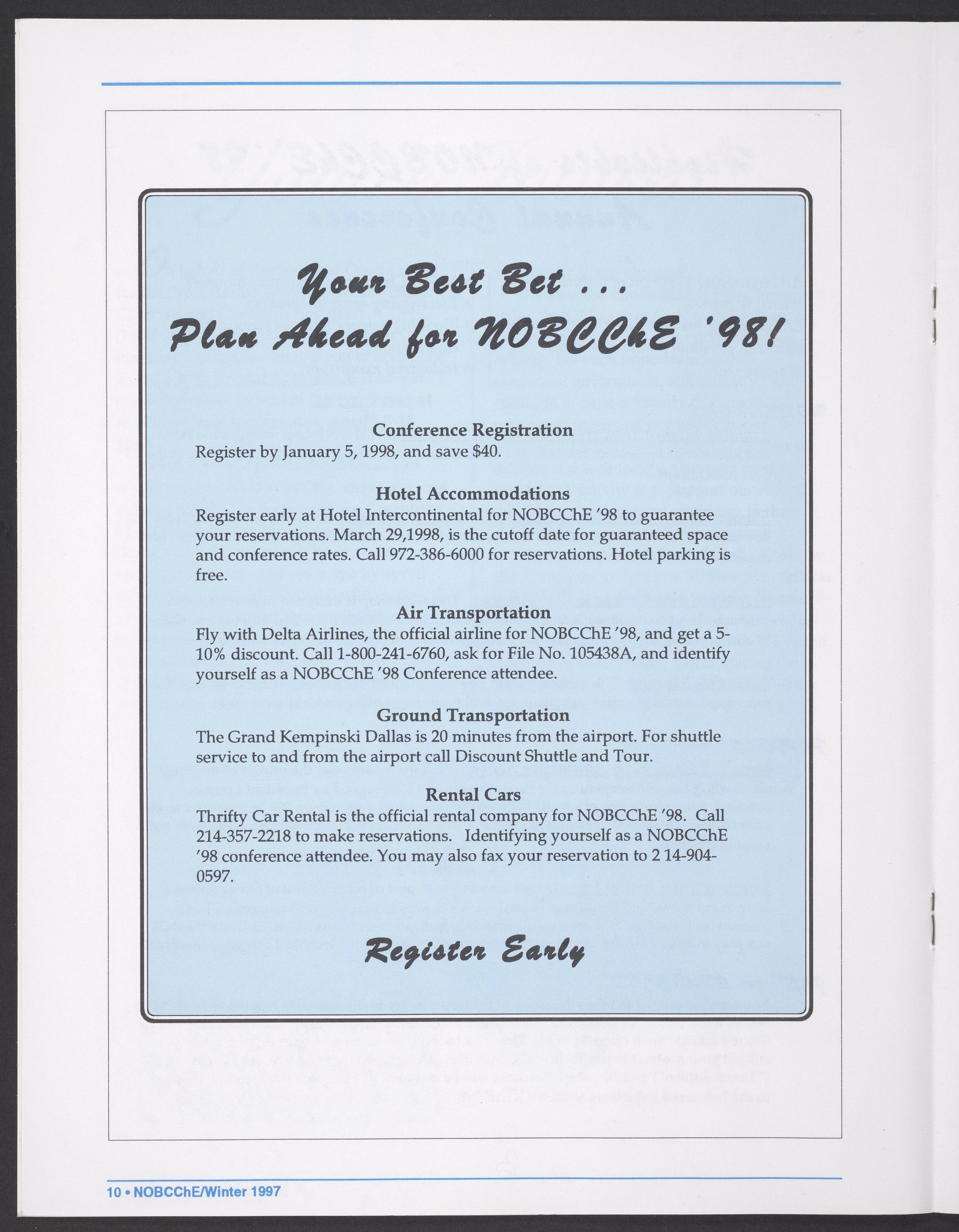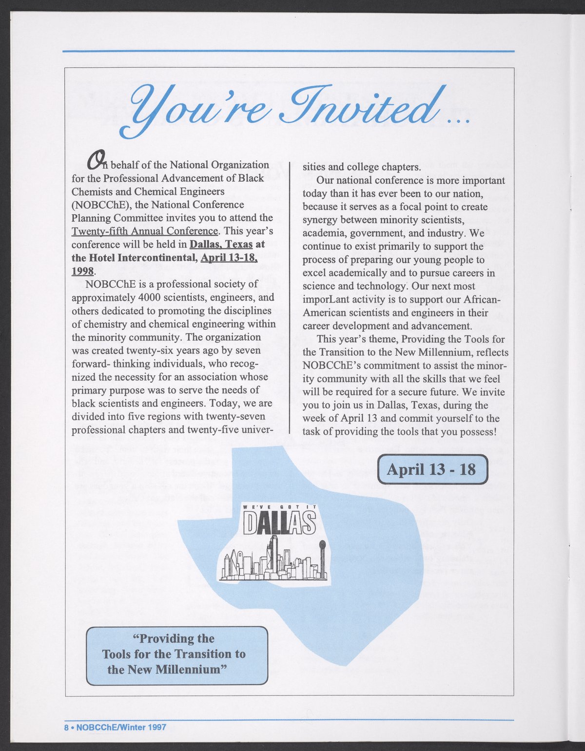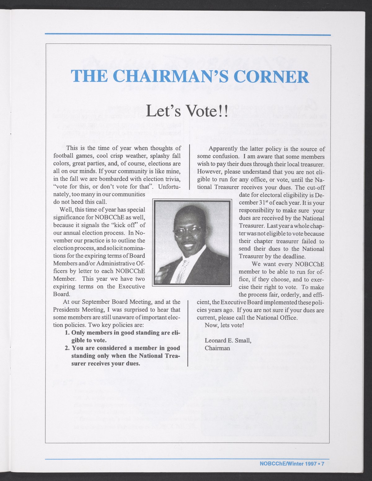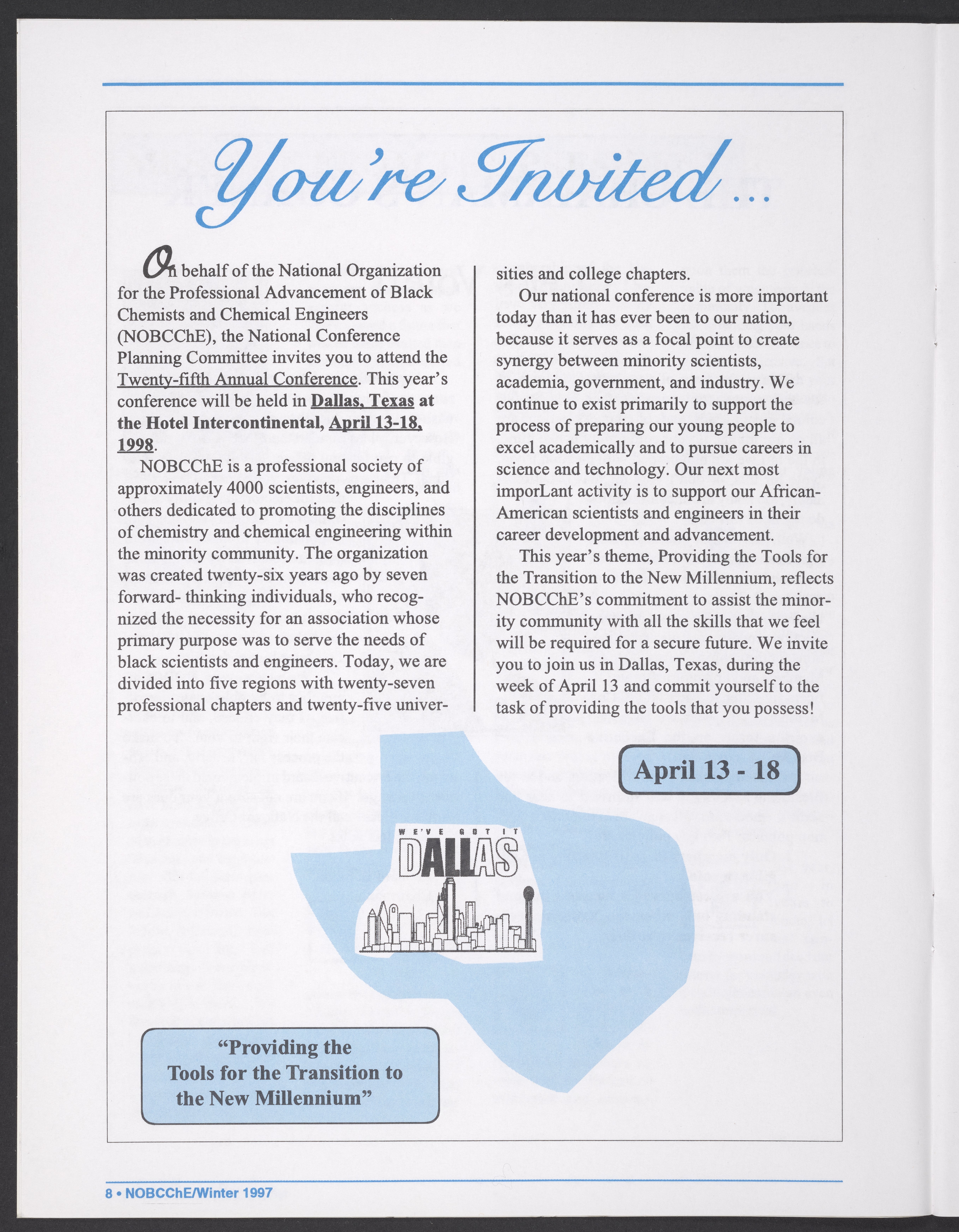 “NOBCChE News, Volume 18, Number 3.” National Organization for Black Chemists and Chemical Engineers, 1997. William A. Lester, Jr. Papers, Box 46, Folder 31. Science History Institute. Philadelphia. https://digital.sciencehistory.org/works/ylmgr6b.