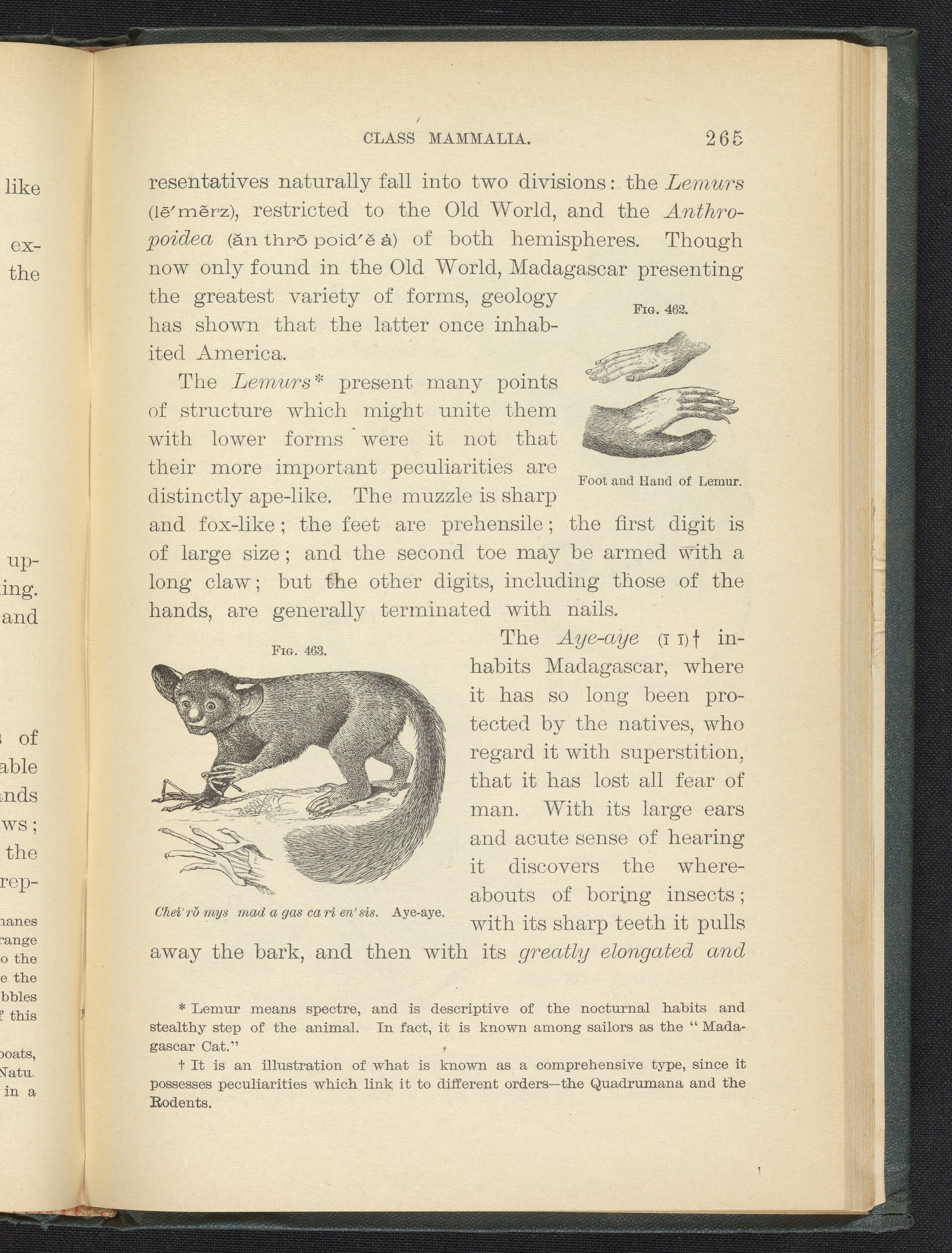 Steele, Joel Dorman, and Jenks, J. W. P. (John Whipple Potter). “Figure 462. Foot and Hand of Lemur. Figure 463. Aye-Aye.” Popular Zoology. New York, New York: Chautauqua Press, 1887. https://digital.sciencehistory.org/works/yls9sg3.