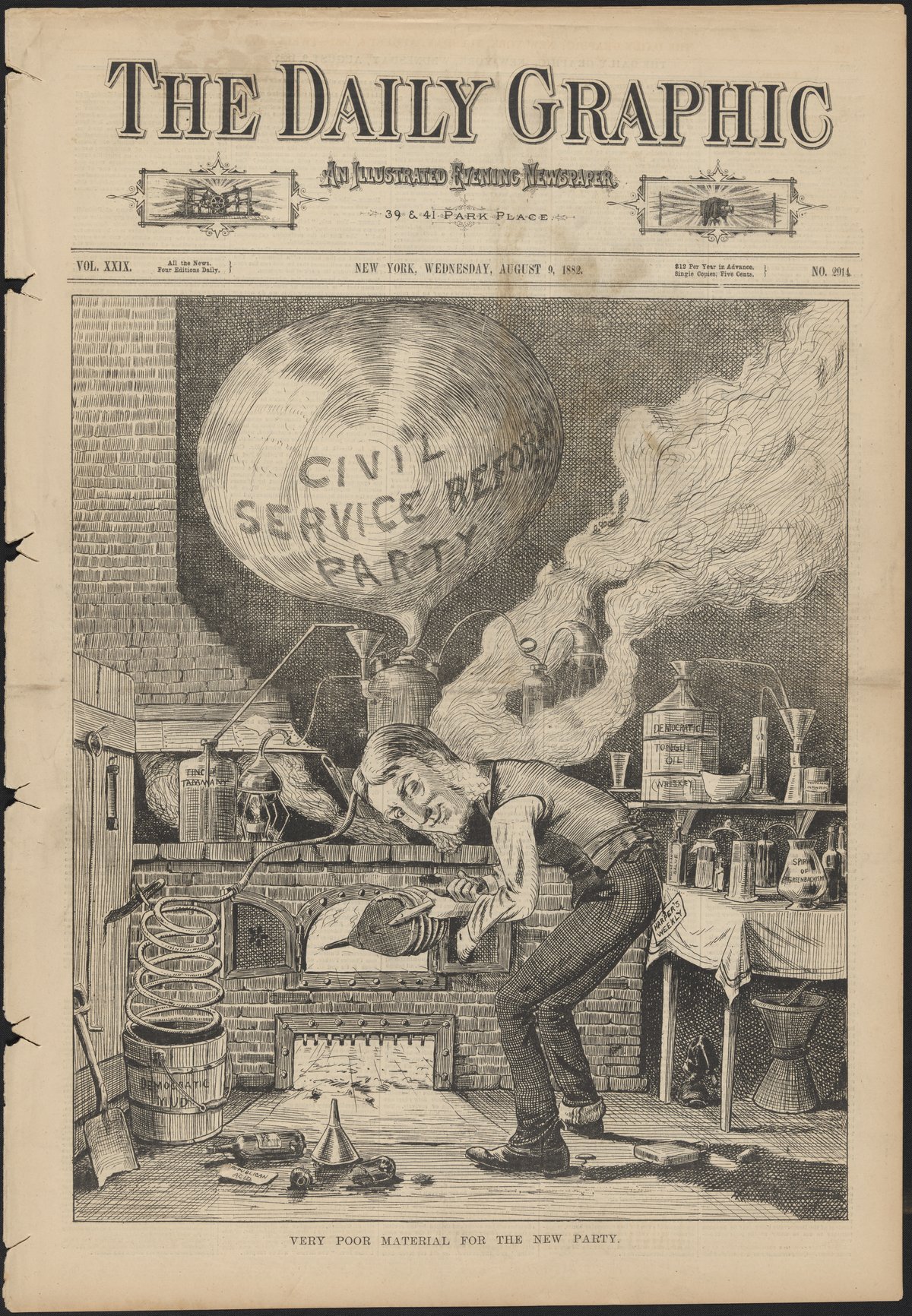This illustration appeared as the front page of the New York Daily Graphic on August 9th, 1882. This political alchemist is a slick newspaperman with mutton chops, toiling in his laboratory to create the spirit of a "civil service reform party." A note hanging from his back pocket tells us he works for Harper’s Weekly. Surrounding him are the tools and materials of alchemy: a furnace and bellows, distillation flasks and alembics, and a mortar and pestle. Many bear labels: "Tincture of Tammany," "Democratic Tongue Oil (Whiskey)," and "Spirit of Greenbackism." Thus in the caustic view of the Daily Graphic, Harper’s had only "very poor material for the new party" and was forced to work with faulty and worn-out ingredients to create something noble.