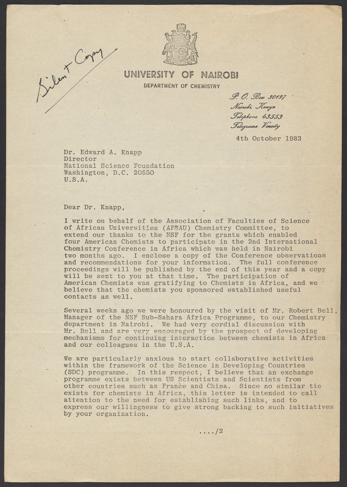 Letter from Raphael M. Munavu to Edward A. Knapp, October 4, 1983