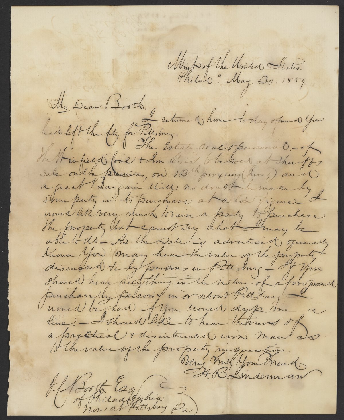 Letter from H.R. Linderman to James Curtis Booth, May 30, 1859