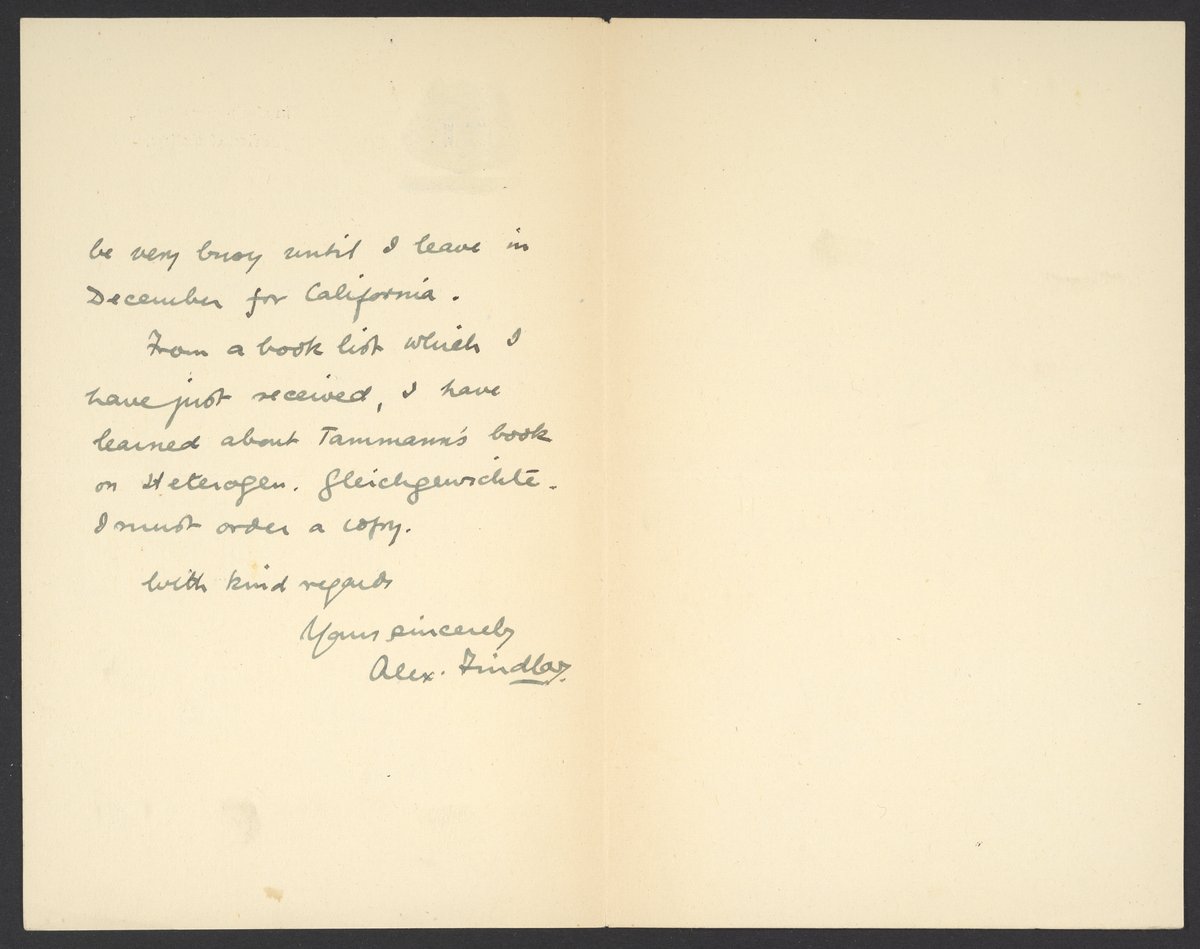 Small JPG1200 x 1771px — 242 KBLarge JPG2880 x 4251px — 1.2 MBFull-sized JPG3010 x 4443px — 1.3 MBOriginal fileTIFF — 3010 x 4443px — 38.3 MBAlexander Findlay (1874-1966) of the University of Aberdeen thanks Georg Bredig (1868-1944) for sending him translated copies of Findlay's The Phase Rule and Its Applications (1904). Findlay also discusses recent and upcoming books.