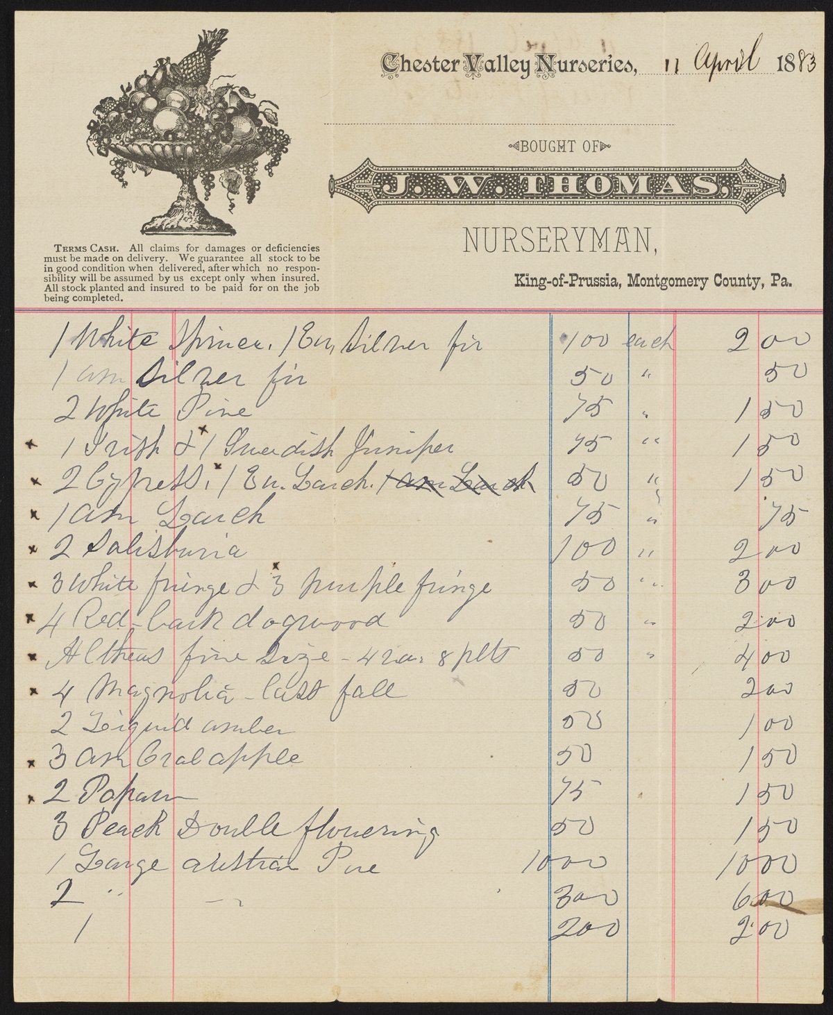 Thomas, Joseph W. “Bill from J.W. Thomas of Chester Vallery Nurseries,” April 11, 1883. Papers of James Curtis Booth, Box 2, Folder 10. Science History Institute. Philadelphia. https://digital.sciencehistory.org/works/yv5zhqe.