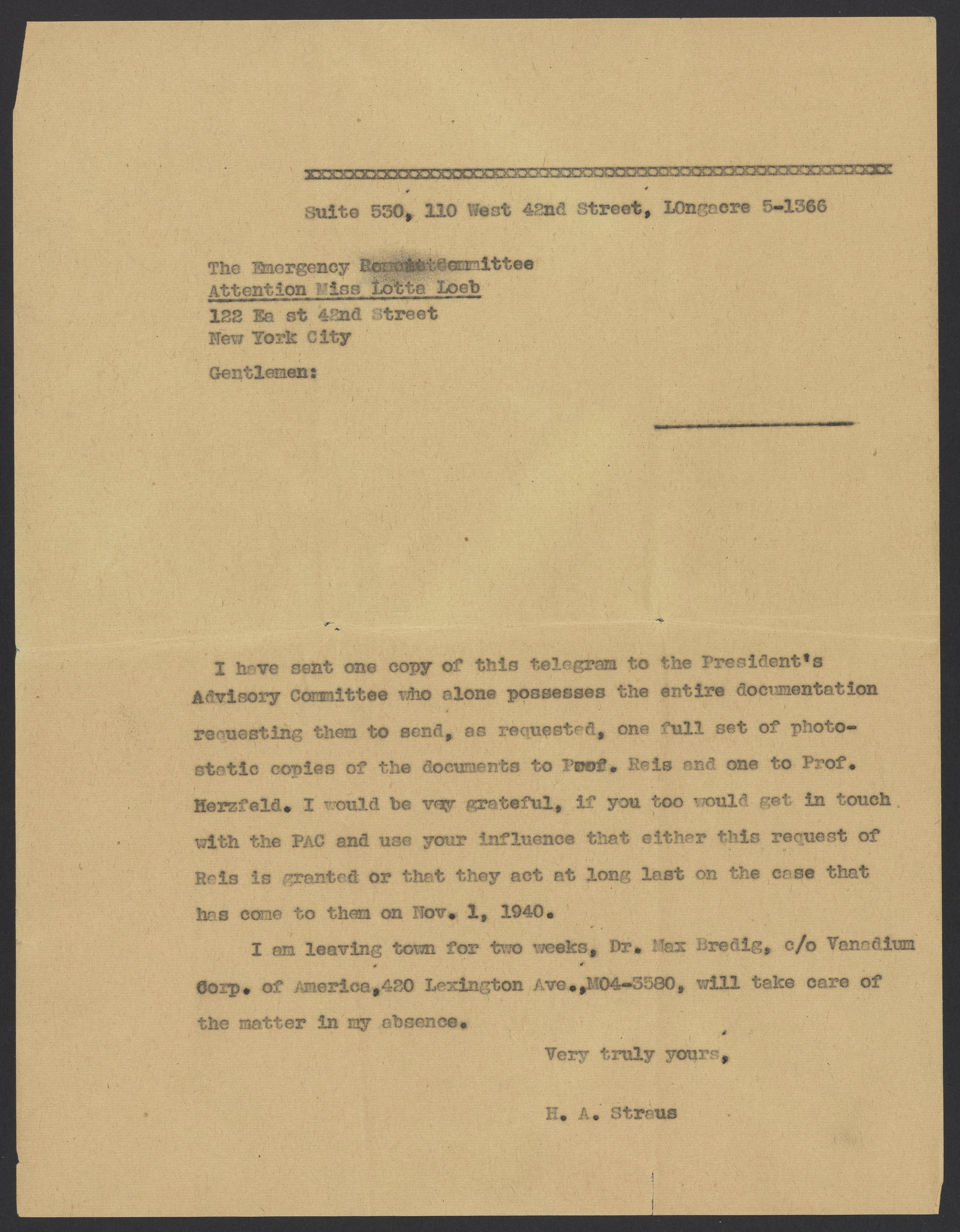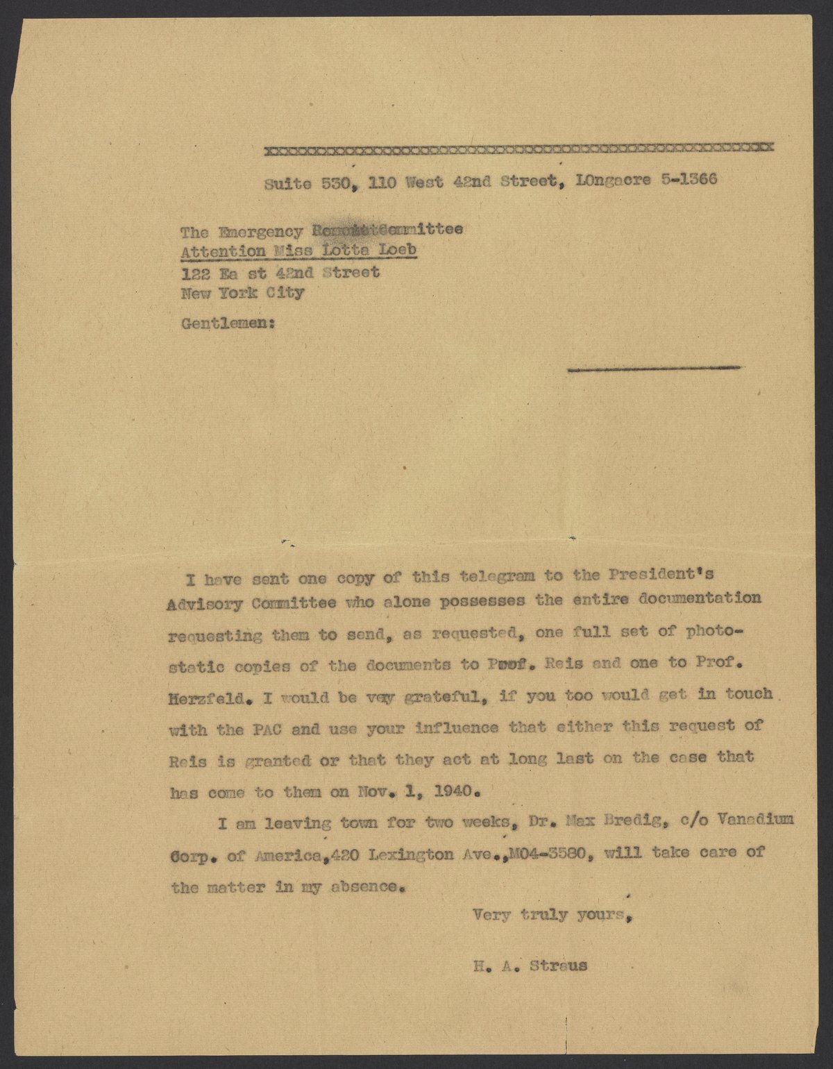 Letter from H. A. Straus to The Emergency Rescue Committee