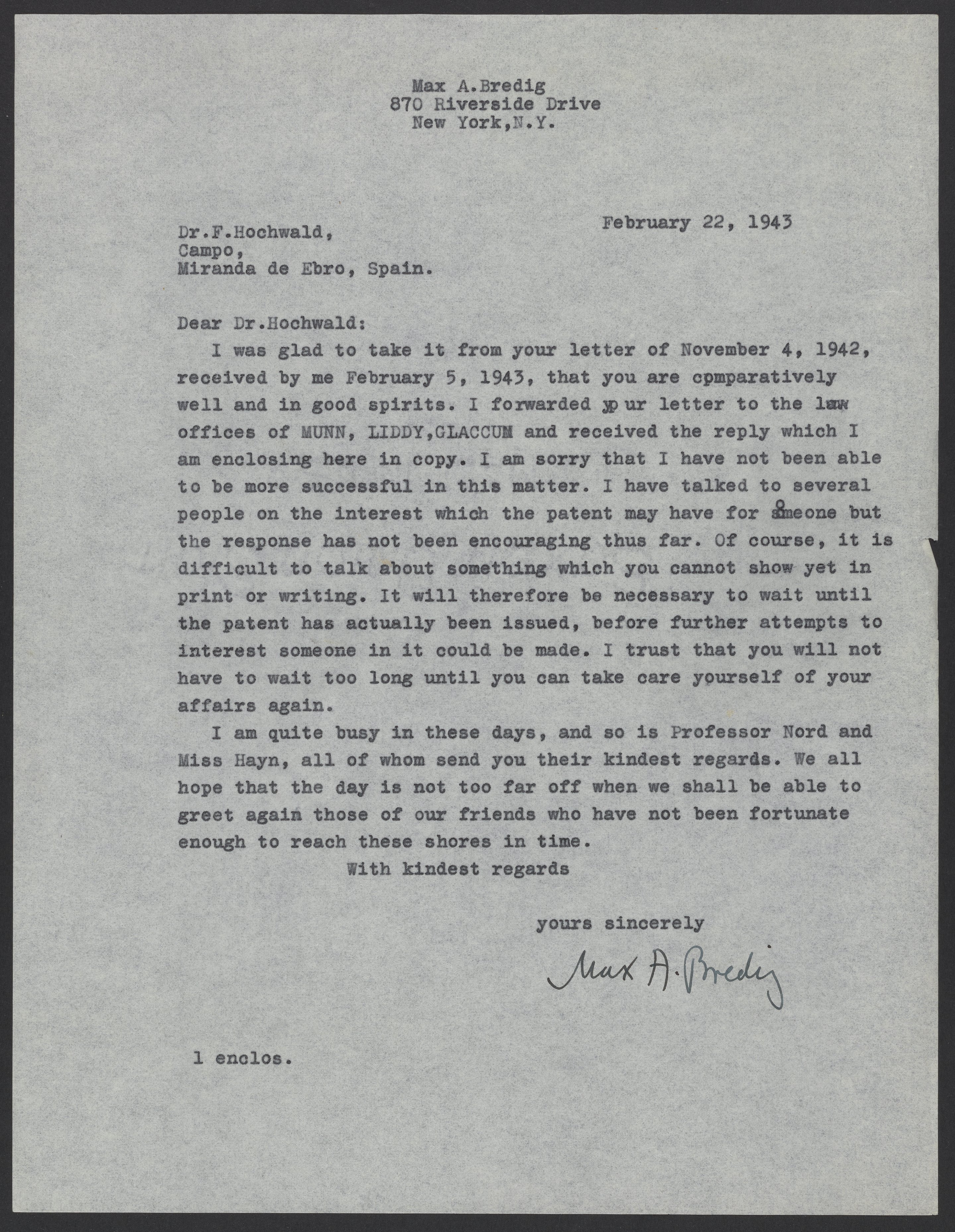 Letter from Max Bredig to Fritz Hochwald, February 22, 1943