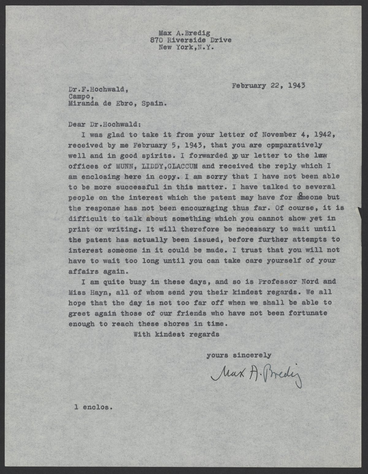 Max Albert Bredig (1902-1977) sends Fritz Hochwald (1897-1968) a response from Munn, Liddy, and Glaccum in reference to a patent application.