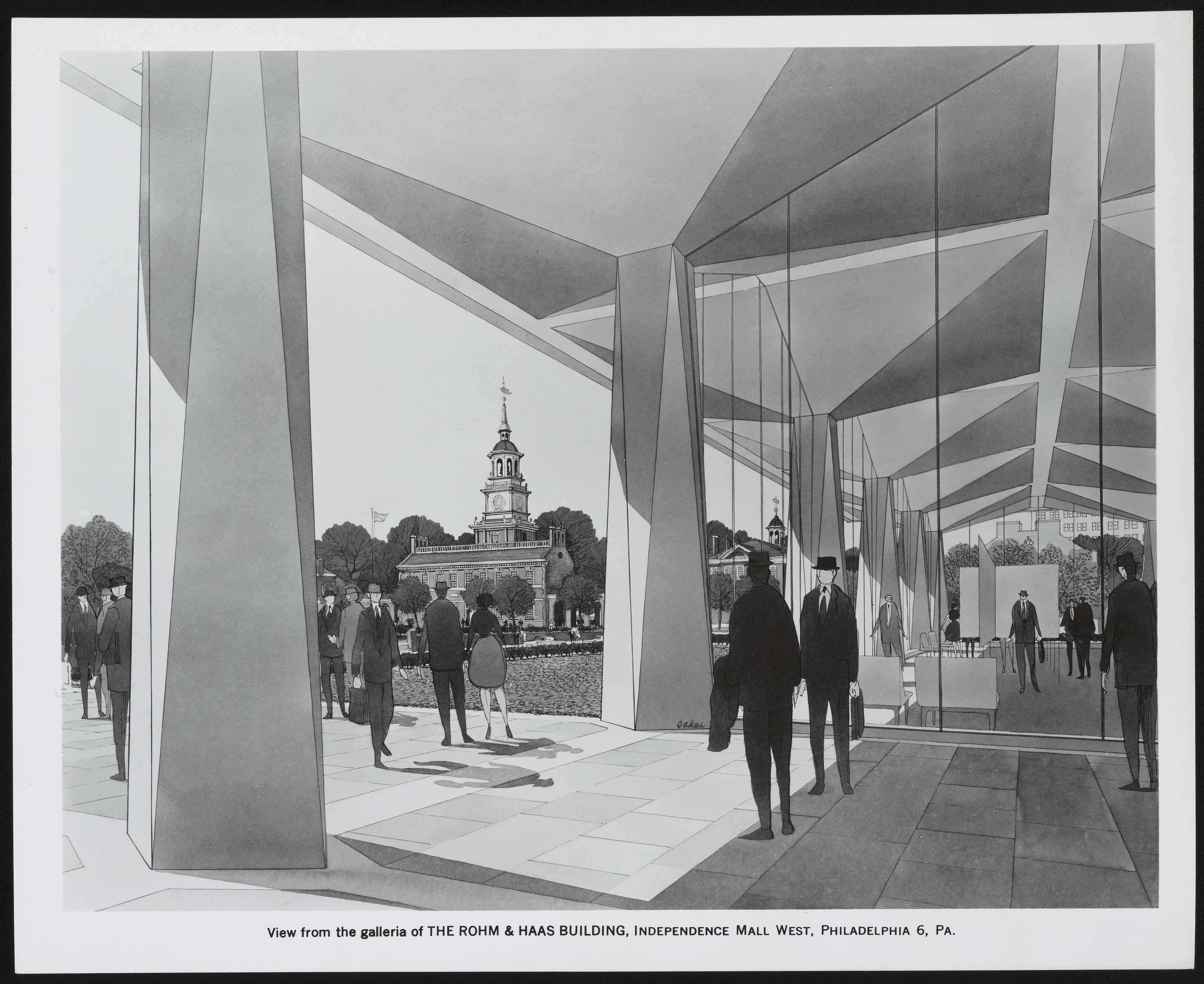 Black and white artist's rendering of the view from the galleria of the Rohm & Haas home office building located on Independence Mall West in Philadelphia, Pennsylvania, including an illustration of nearby Independence Hall.