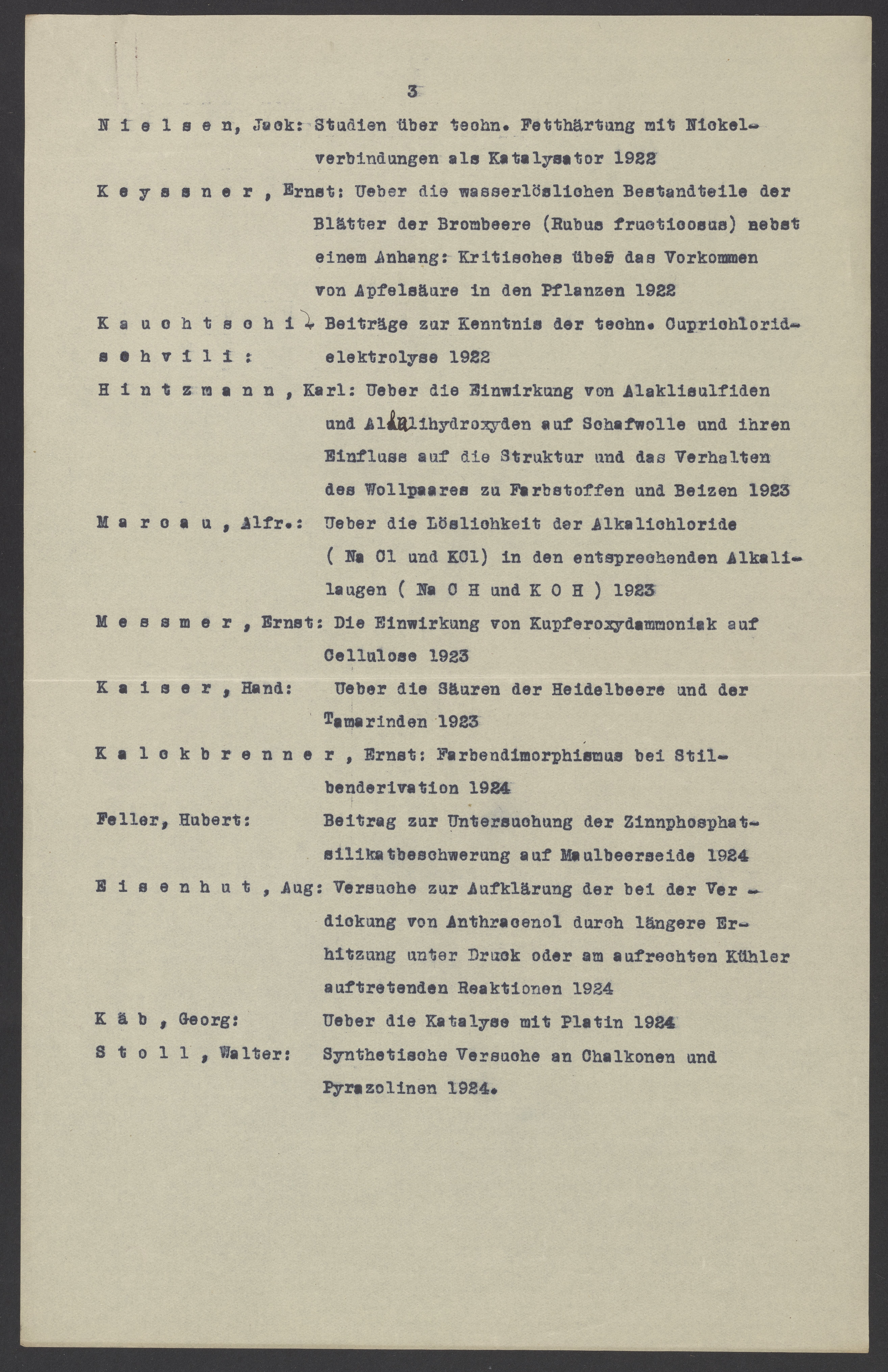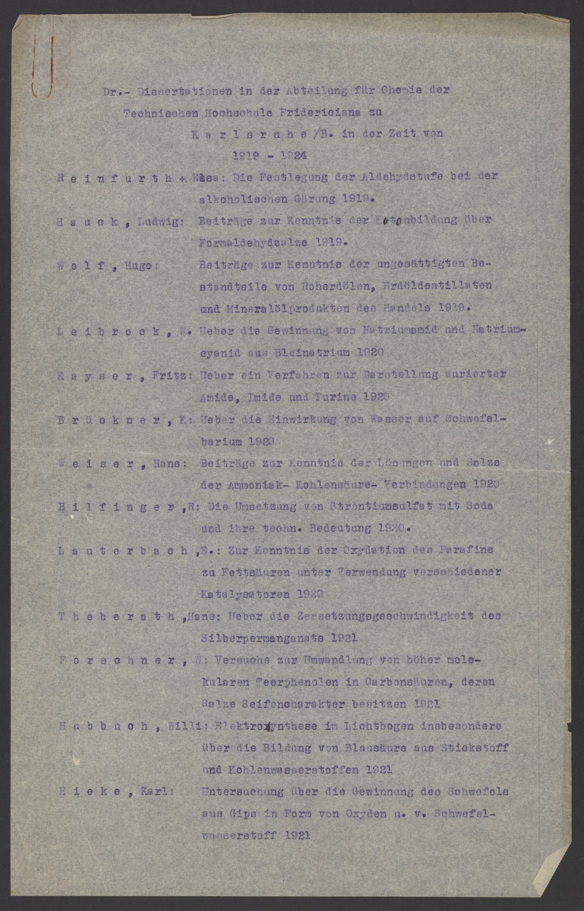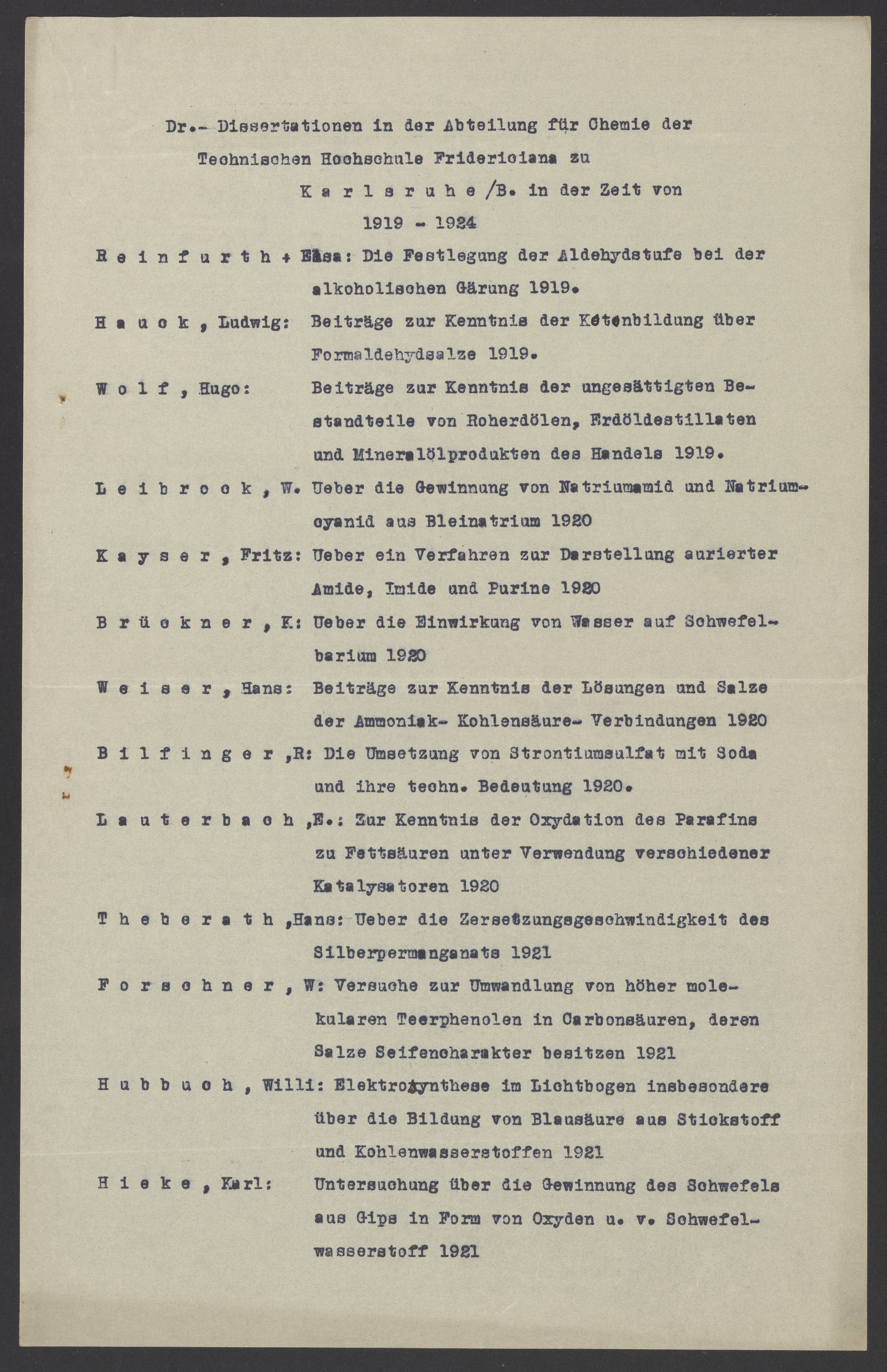 Technische Hochschule Karlsruhe. “List of Dissertations in the Department of Chemistry at Karlsruhe Technical University, 1919-1925,” circa 1925. Papers of Georg and Max Bredig, Box 3, Folder 27. Science History Institute. Philadelphia. https://digital.sciencehistory.org/works/z1wmnto.