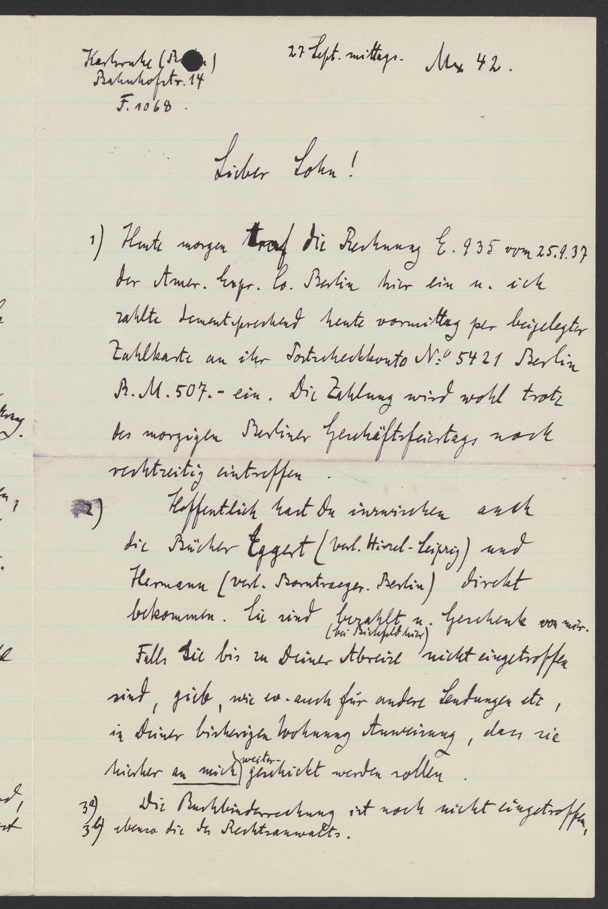 1) Heute morgen traf die Rechnung E. 935 von 25.9.37 der Amer. Expr. Co. Berlin hier ein u. ich zahlte dementsprechend heute Vormittag per beigelegter Zahlkarte an ihr Postscheckkonto No. 5421 Berlin R.M. 507. ein. Die Zahlung wird wohl trotz des morgigen Berliner Geschäftsfeiertags noch rechtzeitig eintreffen.