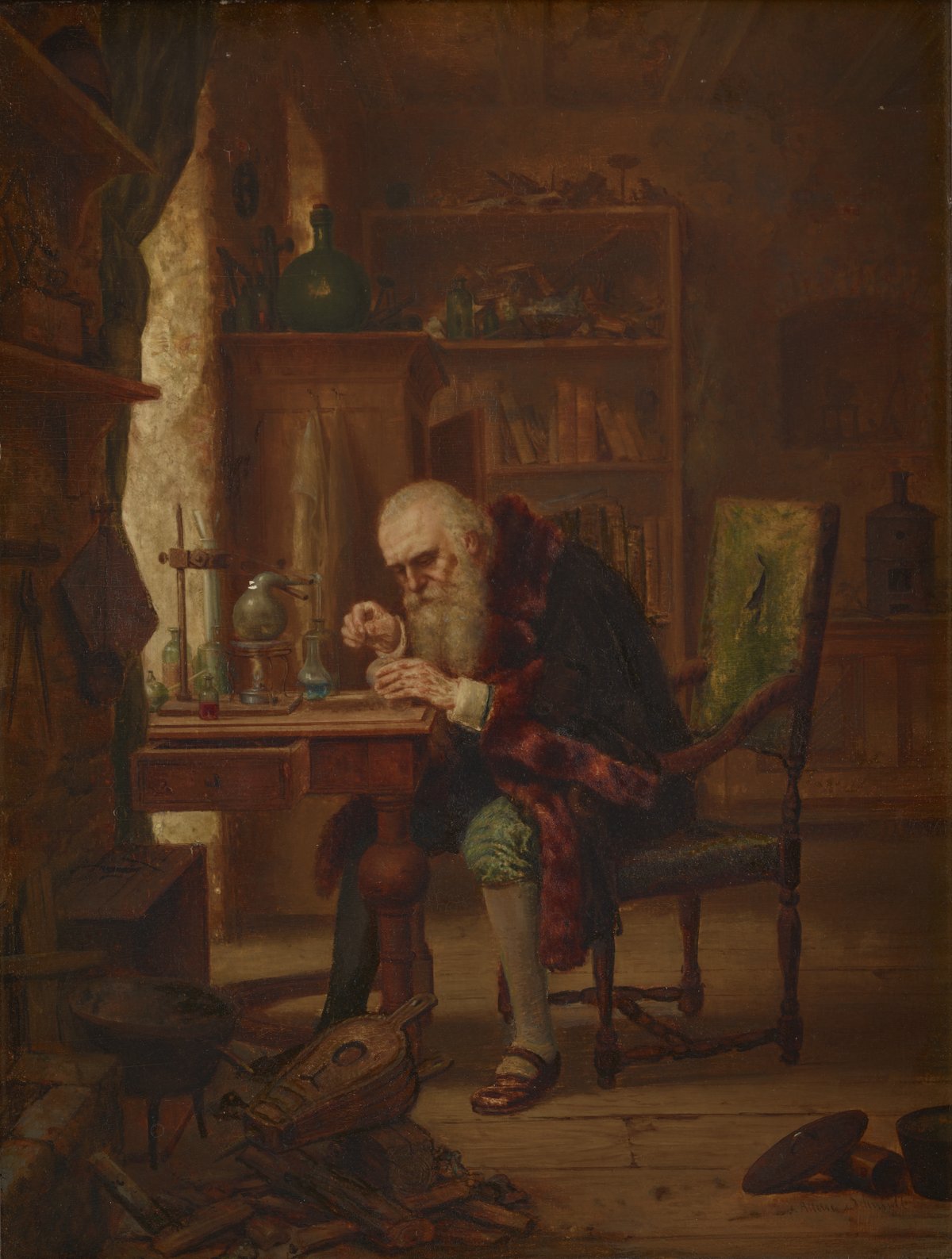 A bearded, elderly alchemist in a fur-trimmed coat leans close over a tabletop experiment. The equipment on his lab bench includes an adjustable clamp stand and an alcohol burner, contemporary to the 1800s. Small vials and flasks, as well as a glass alembic, are arranged over the table or secured with a clamp. In the foreground a small furnace, bellows, and a pile of fuel for the fire suggest further experiment. Though his work is solitary and his surroundings are shabby- even the back of his green velvet chair is torn and dirtied- the large bookcase on the rear wall signals study and scholarly habits.