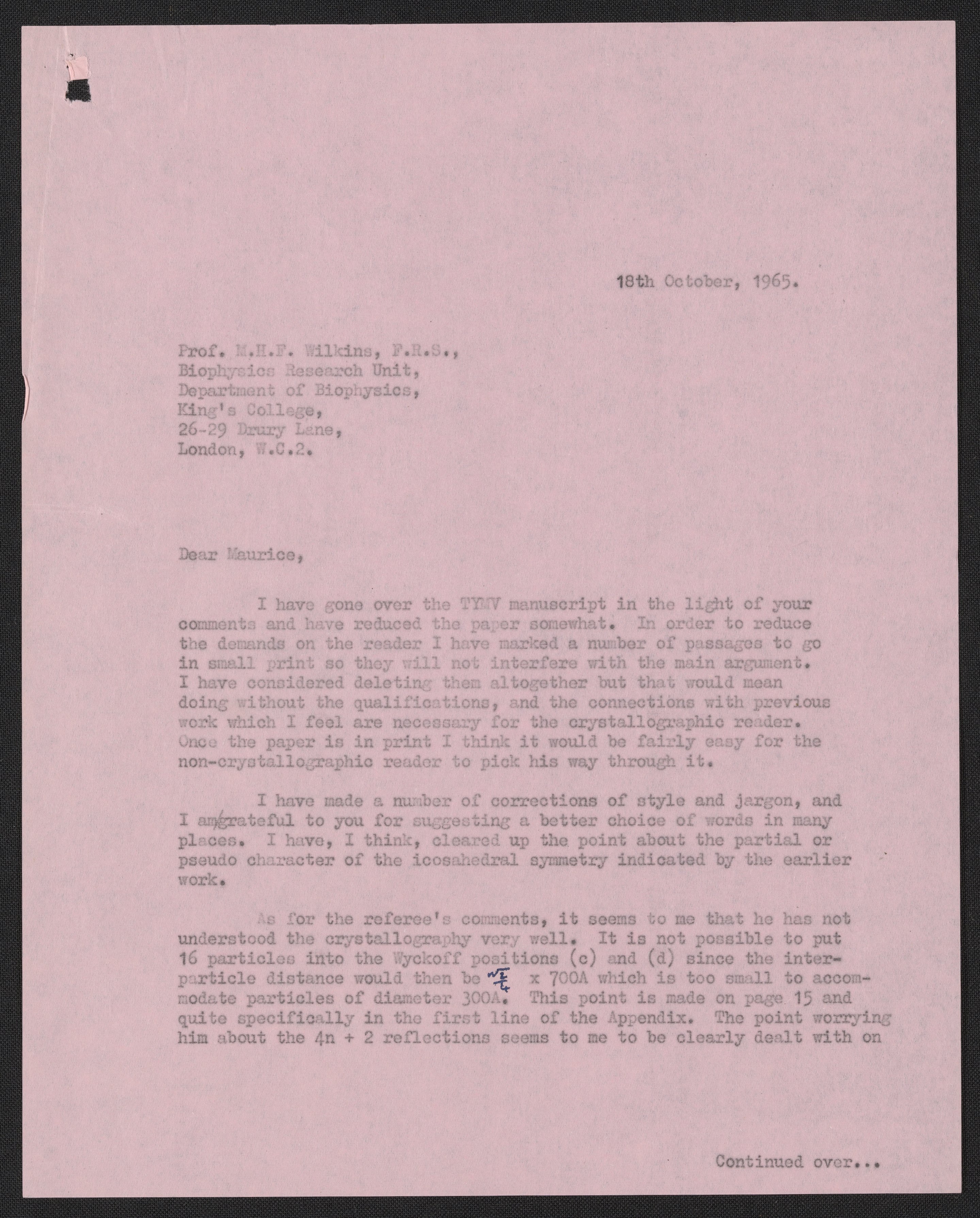 Letter from Aaron Klug to Maurice Wilkins, October 18, 1965