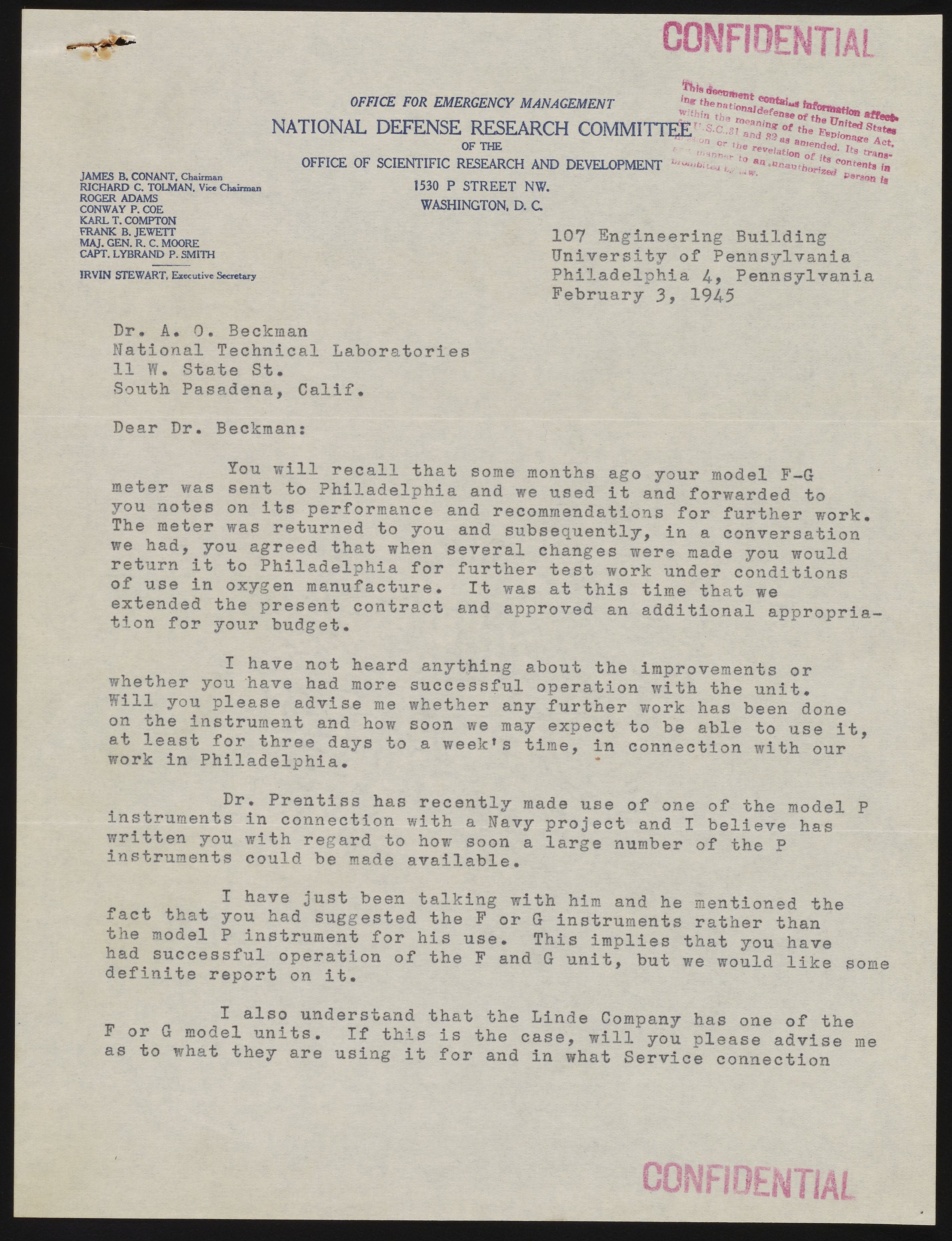 Small JPG1200 x 1563px — 345 KBFull-sized JPG2542 x 3312px — 1.3 MBOriginal fileTIFF — 2542 x 3312px — 24.1 MBIn this letter, J. H. Rushton of the National Defense Research Committee requests an update on the status of F and G model oxygen meter instruments.