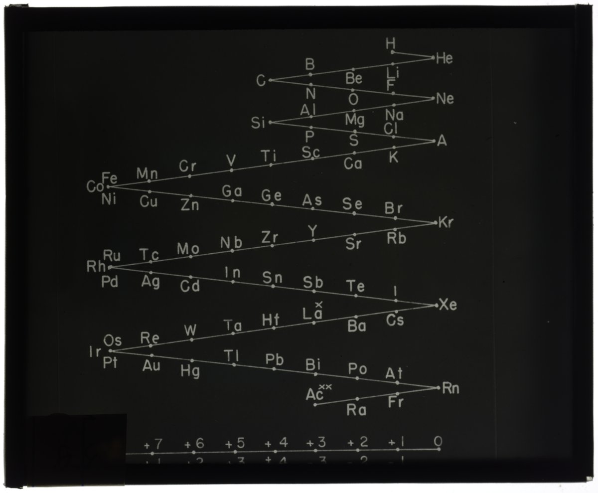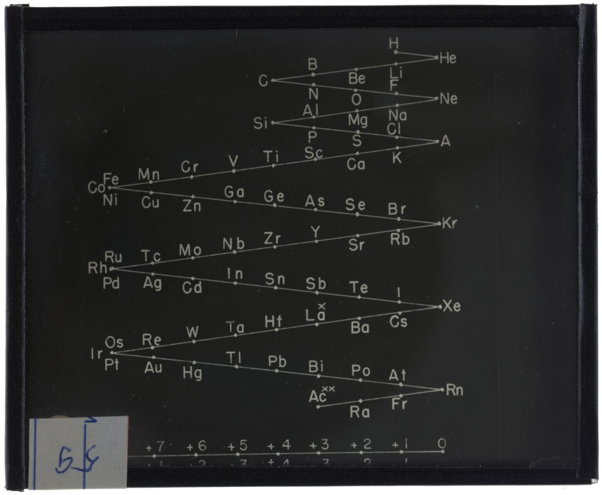 Woodiwiss, George, and Edward G. Mazurs. “Periodic Table in Style of a Zigzag (George Woodiwiss, 1906).” Glass (material), circa 1906–1957. Edward G. Mazurs Collection of Periodic Systems Images, Box 1. Science History Institute. Philadelphia. https://digital.sciencehistory.org/works/z603qz049.