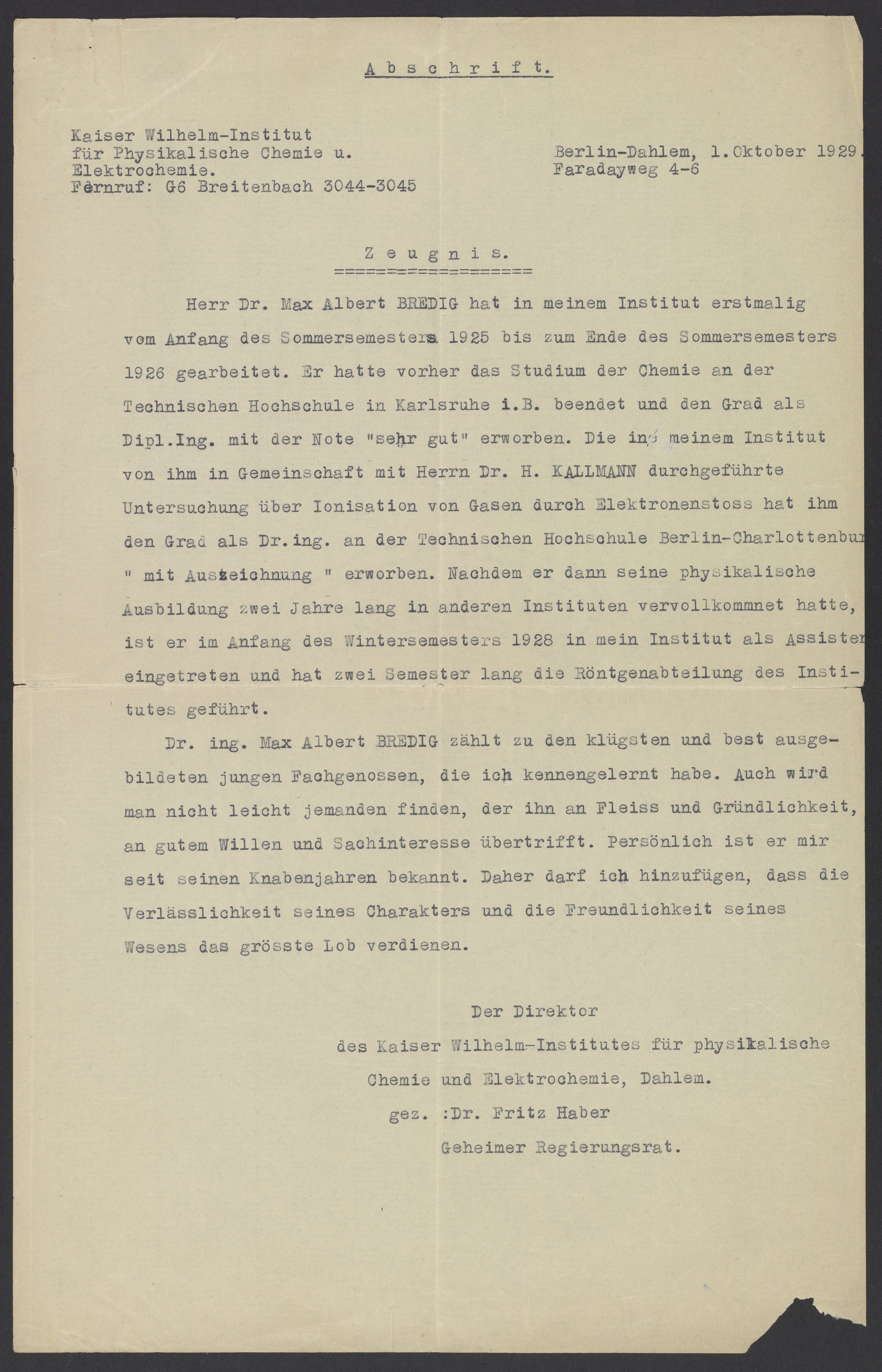 Herr Dr. Max Albert BREDIG hat in meinem Institut erstmalig vom Anfang des Sommersemesters 1925 bis zum Ende des Sommersemesters 1926 gearbeitet. Er hatte vorher das Studium der Chemie and der Technischen Hochschule in Karlsruhe i.B. beendet und den Grad als Dipl. ing. mit der Note „sehr gut“ erworben. Die in meinem Institut von ihm in Gemeinschaft mit Herrn Dr. H. KALLMANN durchgeführte physikalische Untersuchung über Ionisation von Gasen durch Elektronenstoss hat ihm den als Dr. ing. an der Technischen Hochschule Berlin – Charlottenburg „mit Auszeichnung“ erworben. Nachdem er dann seine physikalische Ausbildung zwei Jahre lang in anderen Instituten vervollkommnet hatte, ist er im Anfang des Wintersemesters 1928 in mein Institut als Assistent eingetreten und hat zwei Semester lang die Röntgenabteilung des Institutes geführt.