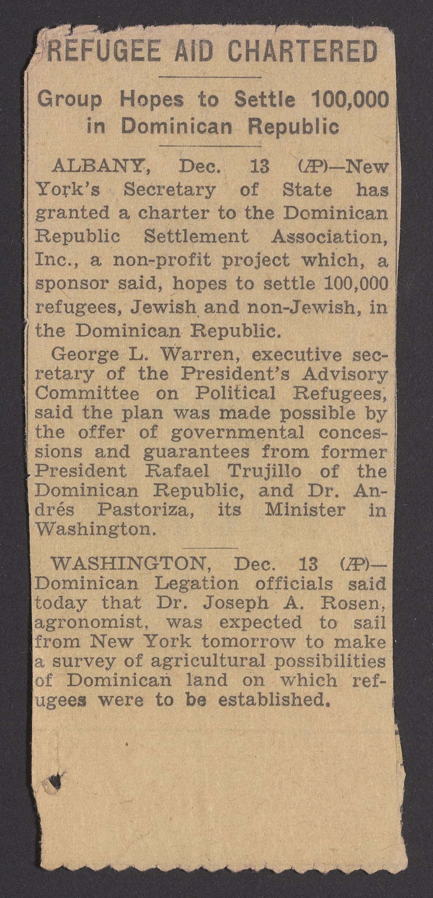 New York times. “Refugee Aid Chartered,” December 14, 1939. Papers of Georg and Max Bredig, Box 10, Folder 23. Science History Institute. Philadelphia. https://digital.sciencehistory.org/works/z7587np.