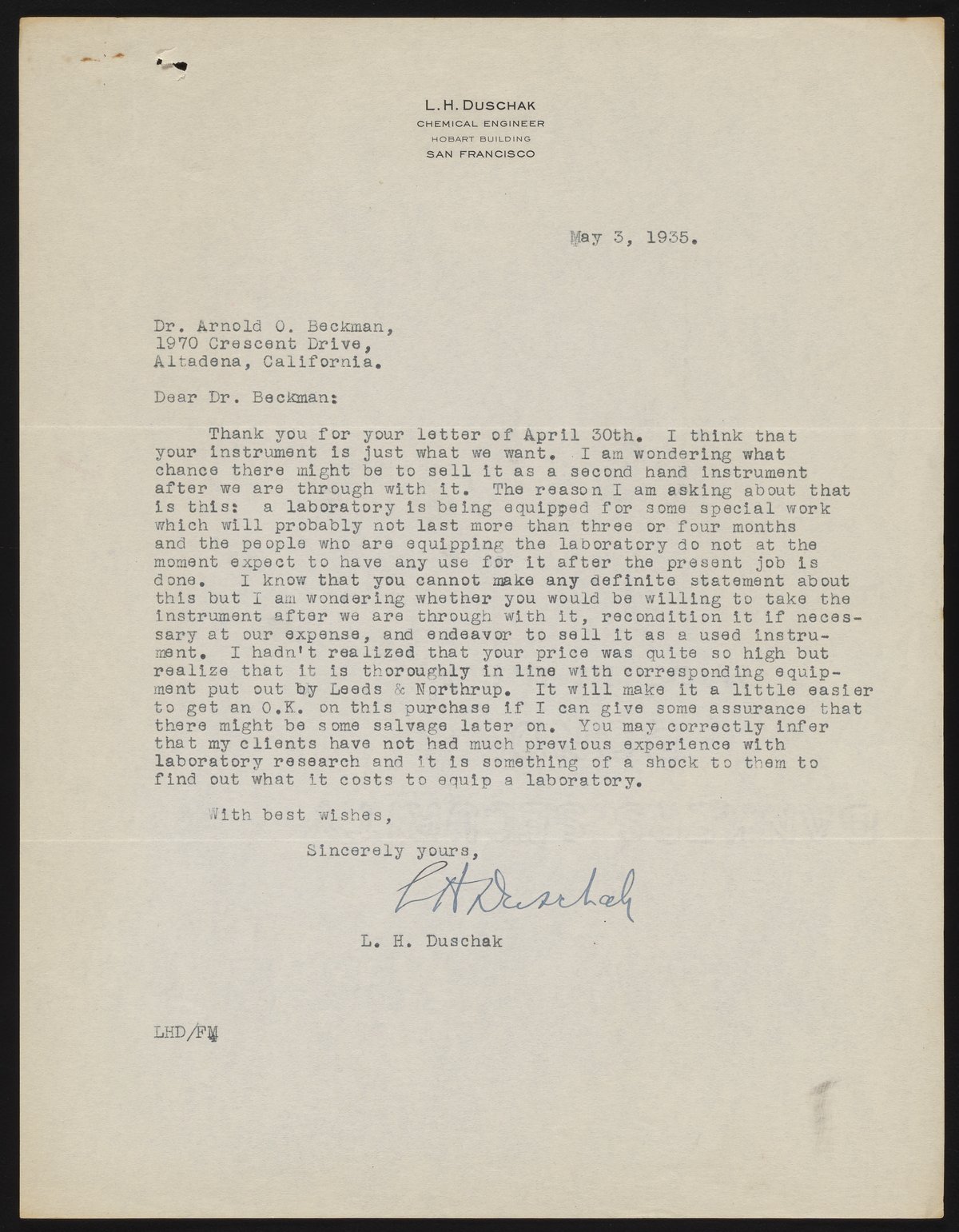 Duschak, L. H. “Letter from L. H. Duschak to Arnold O. Beckman,” May 3, 1935. Beckman Historical Collection, Box 14, Folder 8. Science History Institute. Philadelphia. https://digital.sciencehistory.org/works/z890rt316.