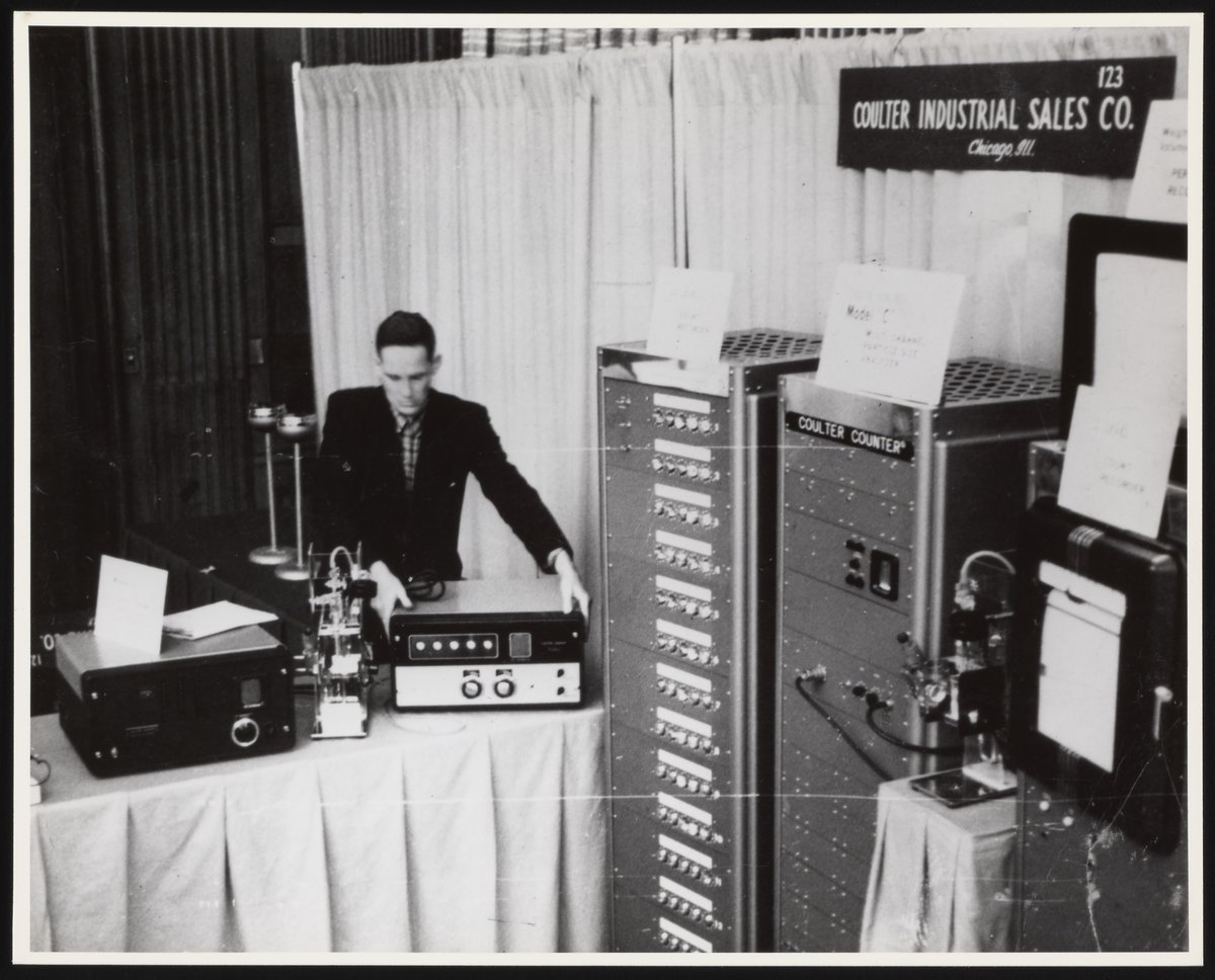 Small JPG1200 x 982px — 89.7 KBLarge JPG2880 x 2357px — 374 KBFull-sized JPG3170 x 2594px — 436 KBOriginal fileTIFF — 3170 x 2594px — 23.6 MBBased on the Coulter principle, the Coulter Counter quantifies and sizes particles suspended in a fluid, like blood cells, bacteria, and a wide variety of other substances. The instrument works by drawing liquid containing the particles through a channel, where each particle releases an electrical charge that is measured and counted. The Coulter principle was discovered by Wallace H Coulter in the late 1940s and patented in 1953. The Coulter counter was manufactured by Coulter Corporation until 1997, when the company was acquired by Beckman Instruments and became known as Beckman Coulter, Inc.