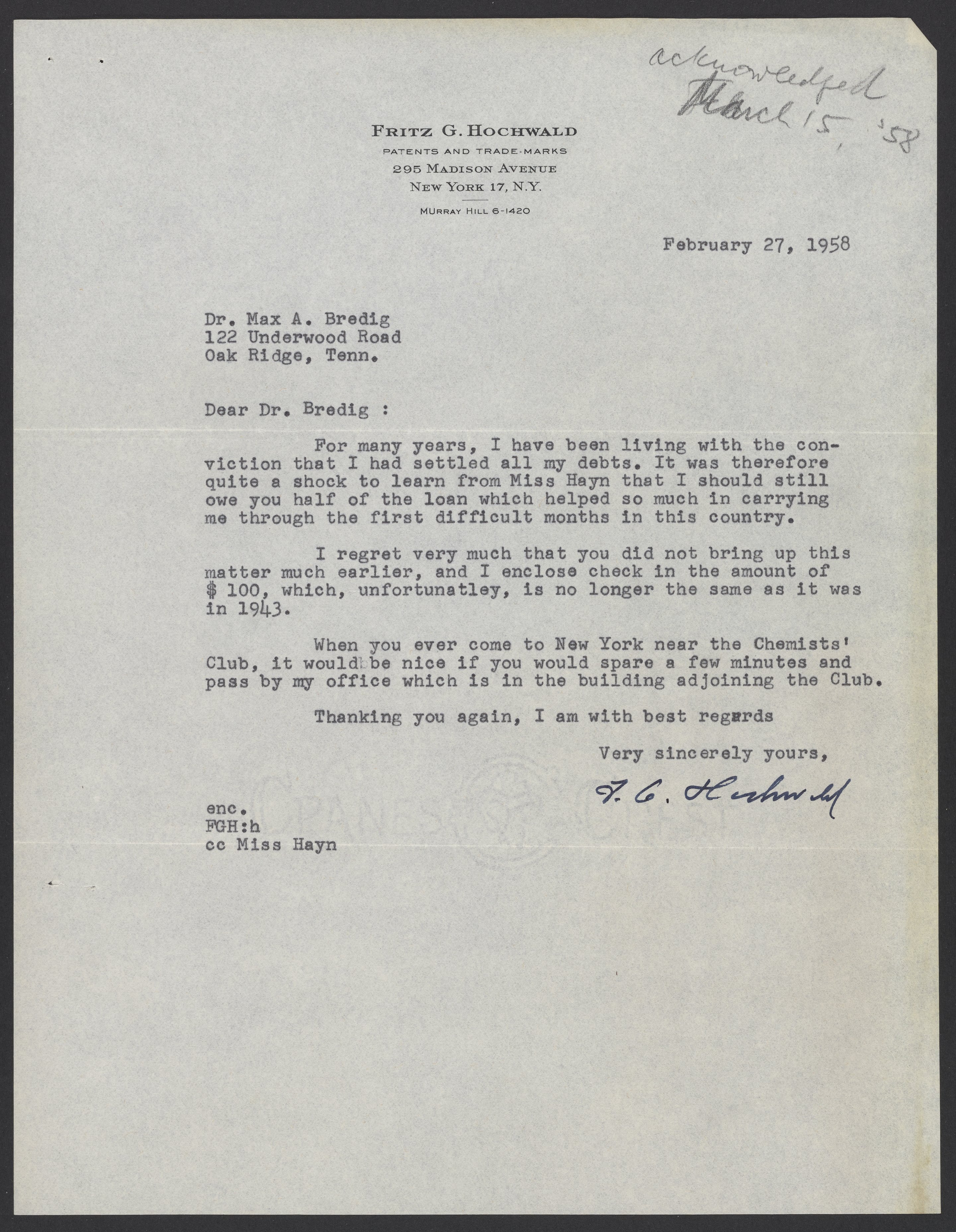 Letter from Friz Hochwald to Max Bredig, February 27, 1958