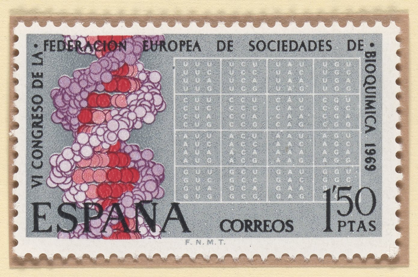 1969 Spanish postage stamp commemorating the VI Congress of the European Federation of Biochemistry Societies (FEBS), held in Madrid.