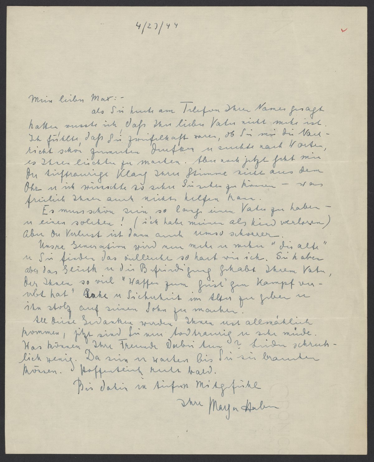 als Sie heute am Telefon Ihren Name gesagt hatten, wusste ich daß Ihr lieber Vater nicht mehr ist. Ich fühlte, daß Sie zweifelhaft waren, ob Sie mir die Nachricht schon zumuten dürfen u. suchte nach Worten, es Ihnen leichter zu machen. Aber noch jetzt geht mir der traurige Klang Ihrer Stimme nicht aus dem Ohr u. ich wünschte zu sehr Sie sehen zu können – was freilich Ihnen auch nichts helfen kann.