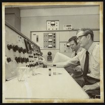 Installation of the Mass Spectrometer 9 (MS-9) at the Humble Oil and Refining Company Research and Development Division laboratory located in Baytown, Texas. Present in the photograph are, from left, Henry Earle Lumpkin (Mass Spectrometrist, Humble Oil and Refining Company); Nigel Bean (Erection Engineer, Associated Electrical Industries); Joe Daniels (Electronics Engineer, Humble Oil and Refining Company); and Peter Dammers (Engineer Trainee, Associated Electrical Industries).