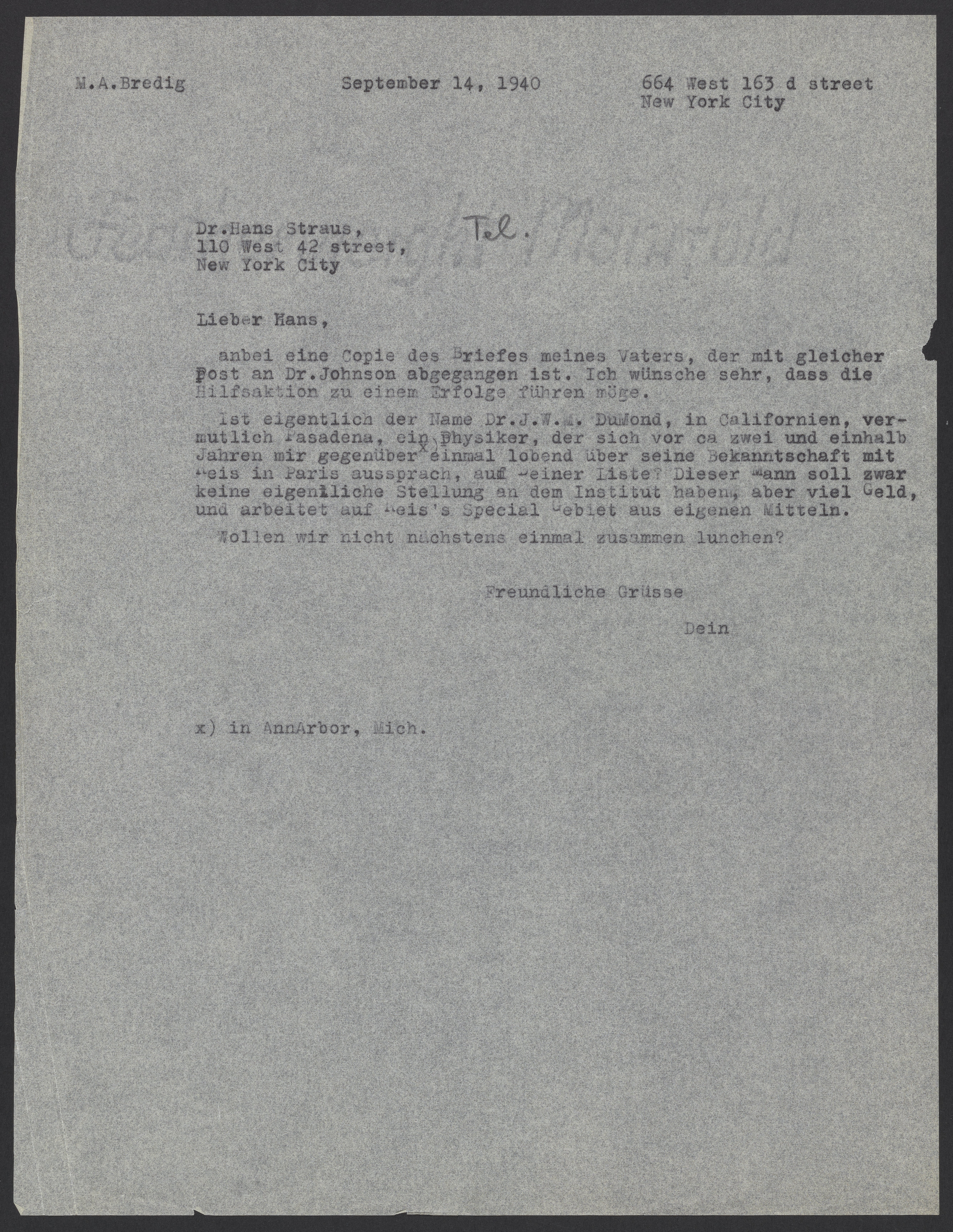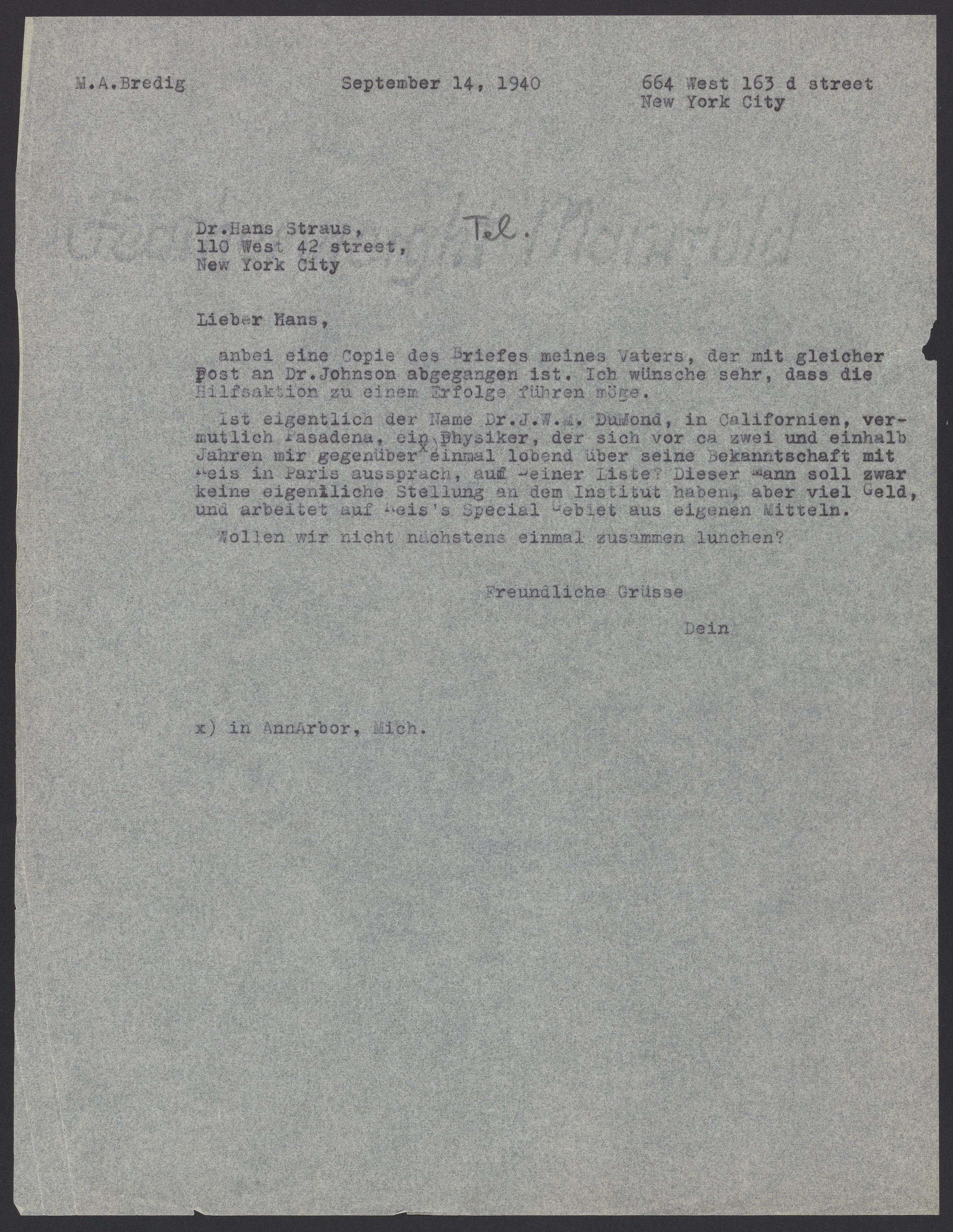 Ist eigentlich der Name Dr. J.W.M DuMond, in Californien, vermutlich Pasadena, ein Physiker, der sich vor ca zwei und einhalb Jahren mir gegenüber* einmal lobend über seine Bekanntschaft mit Reis in Paris, auf Deiner Liste? Dieser Mann soll zwar keine eigentliche Stellung an dem Institut haben, aber viel Geld, und arbeitet auf Reis’s Special Gebiet aus eigenen Mitteln.