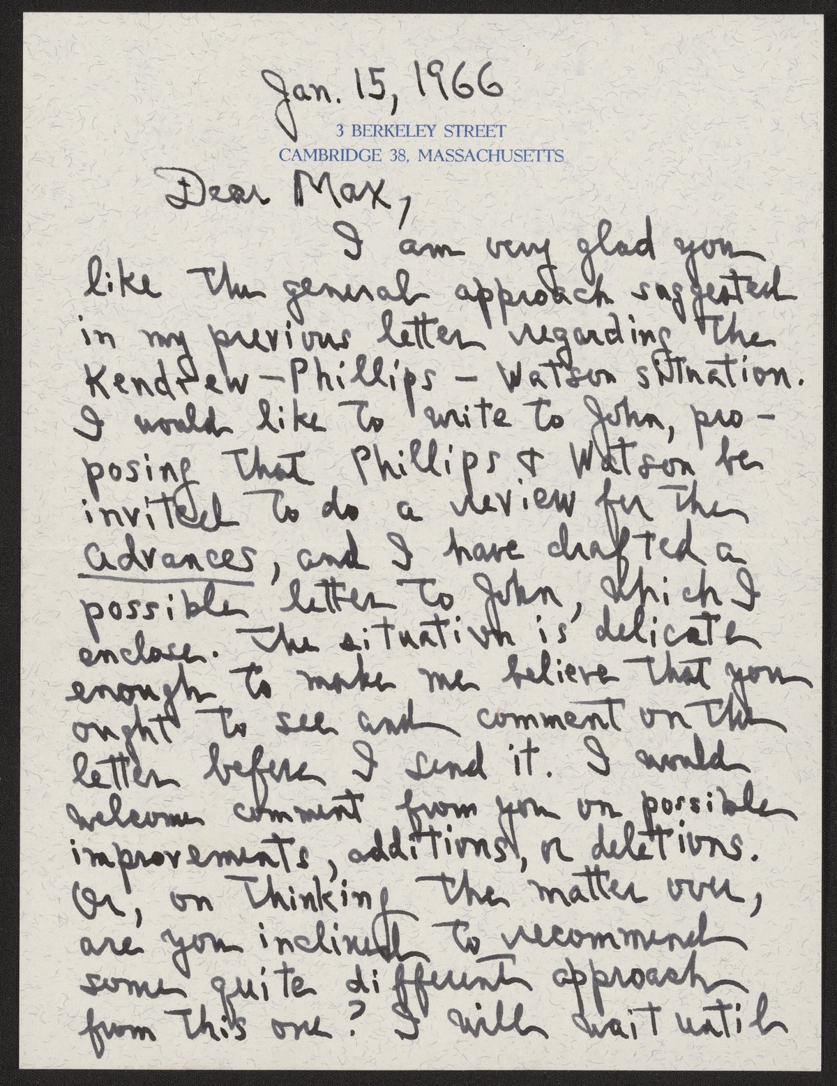 Edsall, John T. (John Tileston). “Letter from John T. Edsall to Max Perutz, January 15, 1966,” January 15, 1966. History of Molecular Biology Collection, Box 74, Folder 12. Science History Institute. Philadelphia. https://digital.sciencehistory.org/works/zgtfw50.
