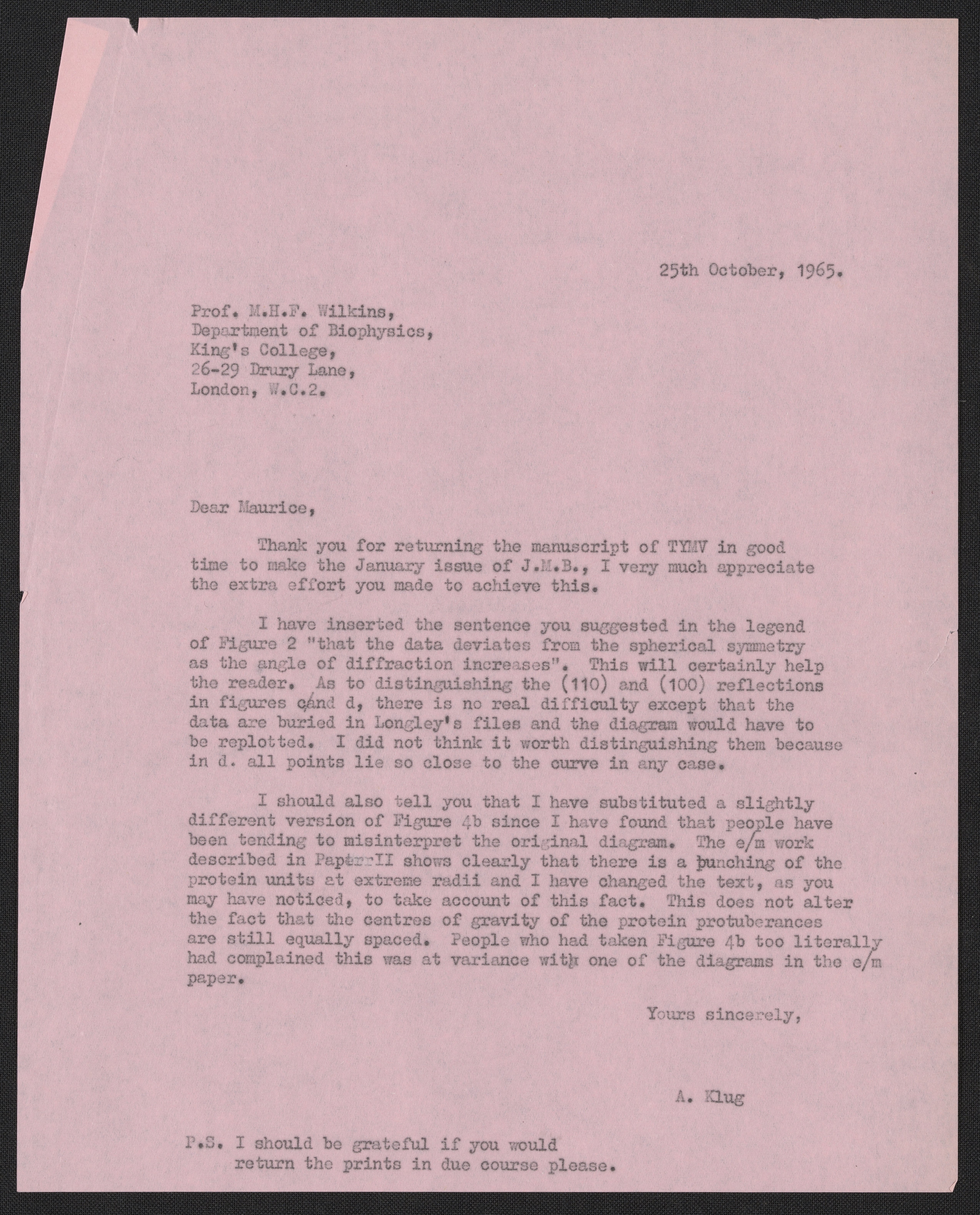 Letter from Aaron Klug to Maurice Wilkins, October 25, 1965