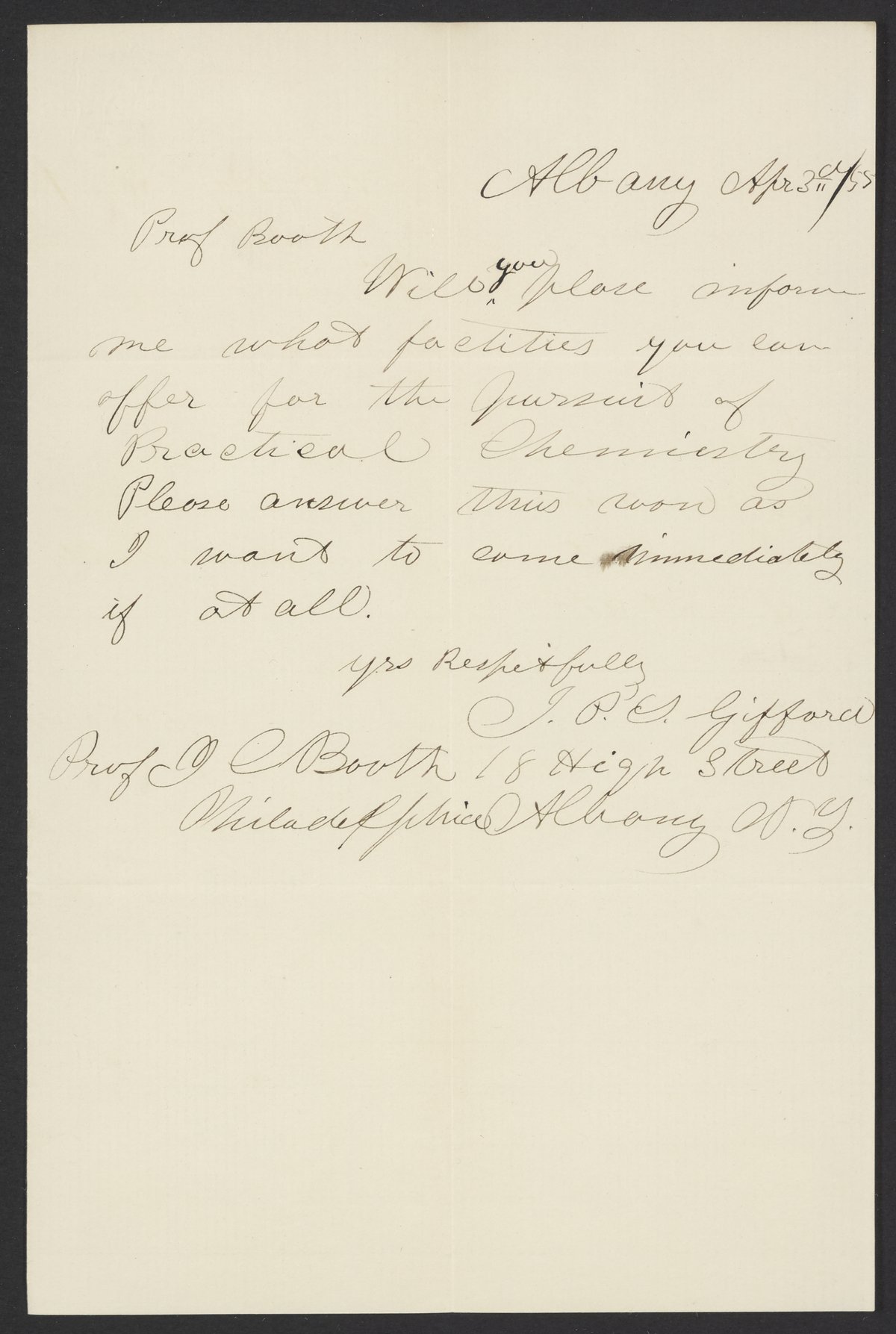 Letter from J.P. Gifford to James Curtis Booth, April 3, 1855