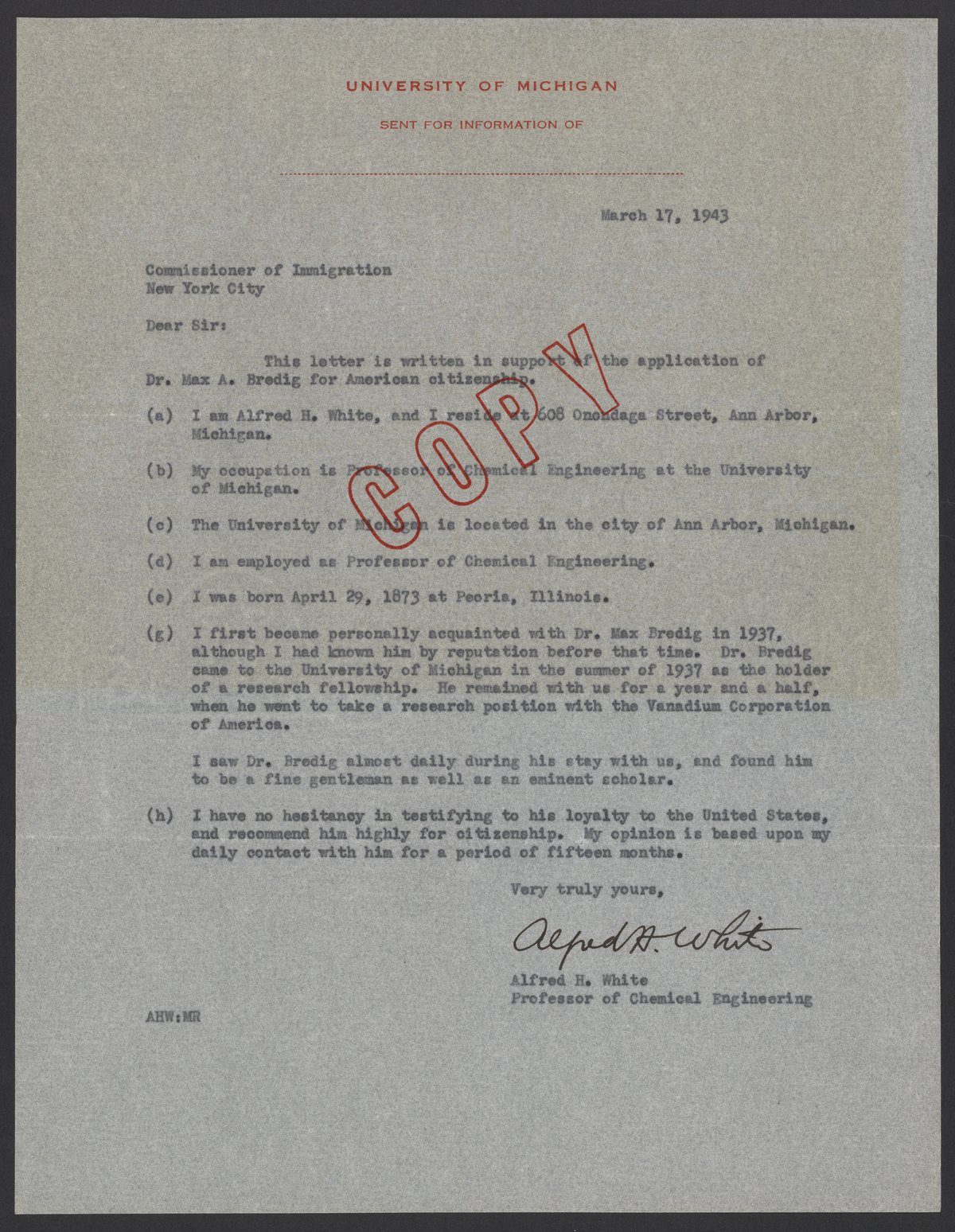 Testimony from Alfred H. White to the Commissioner of Immigration, March 17, 1943
