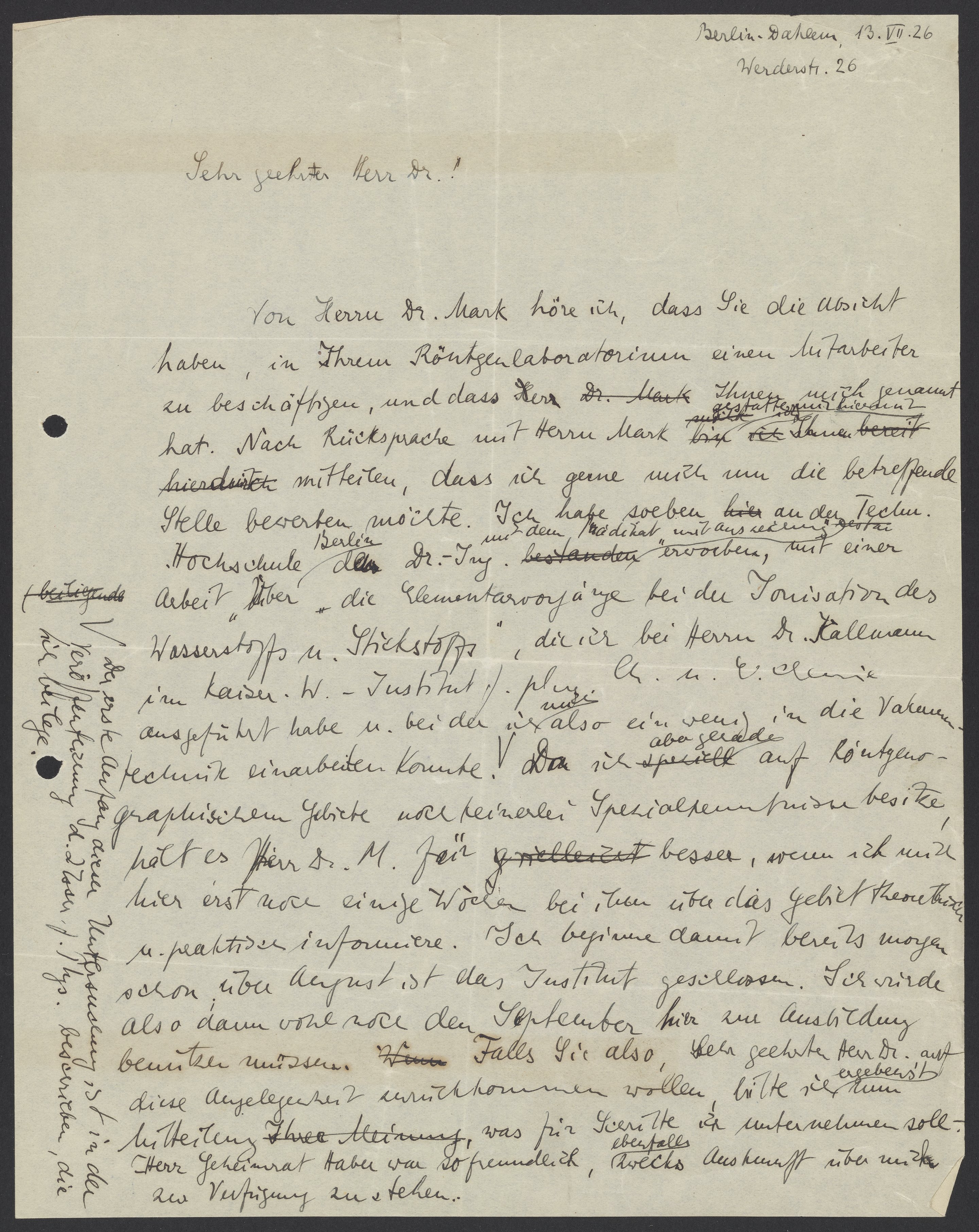 Max Bredig (1902-1977) drafts a letter regarding potential employment.