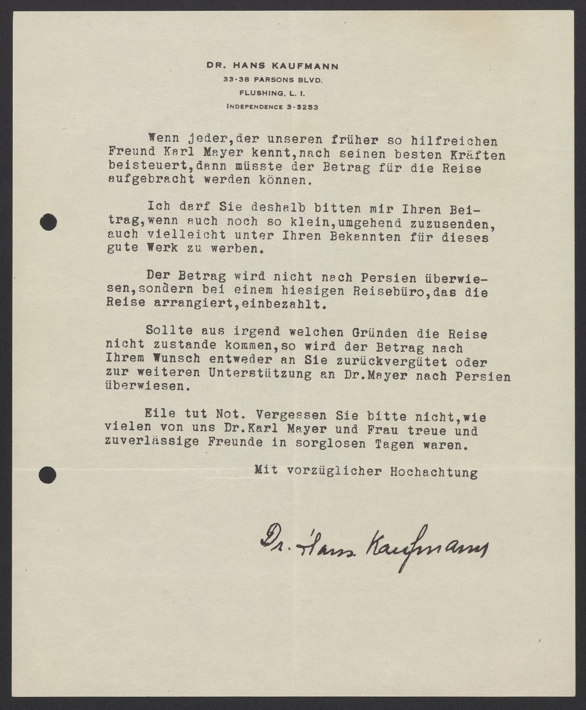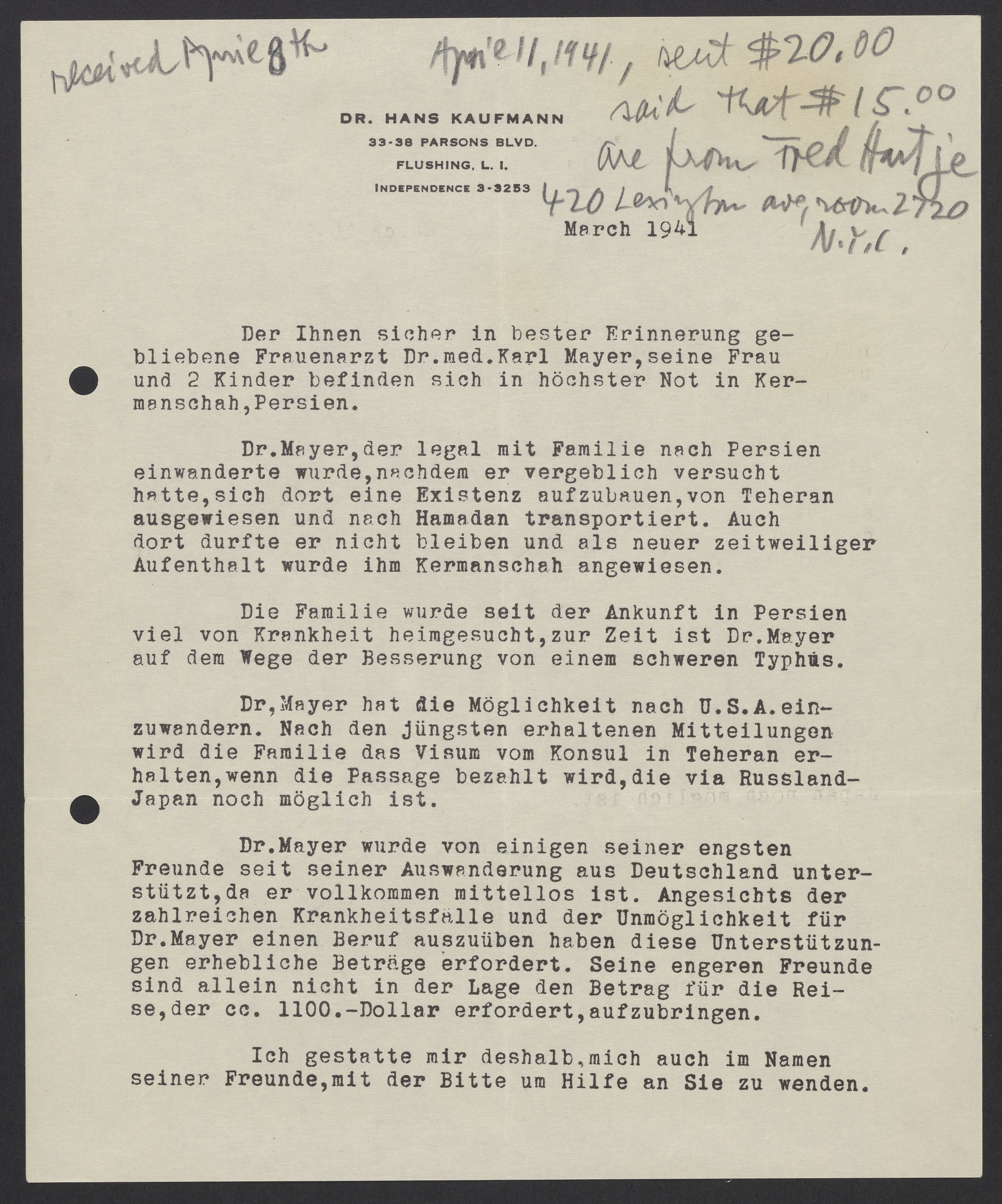 Small JPG1200 x 1442px — 321 KBLarge JPG2880 x 3461px — 1.8 MBFull-sized JPG4468 x 5369px — 4.1 MBOriginal fileTIFF — 4468 x 5369px — 68.7 MBHans Kaufmann requests donations to support a German Jewish doctor, Dr. Karl Mayer, and his family. The Mayers recently fled Nazi-occupied Germany and are currently living as refugees in Persia.