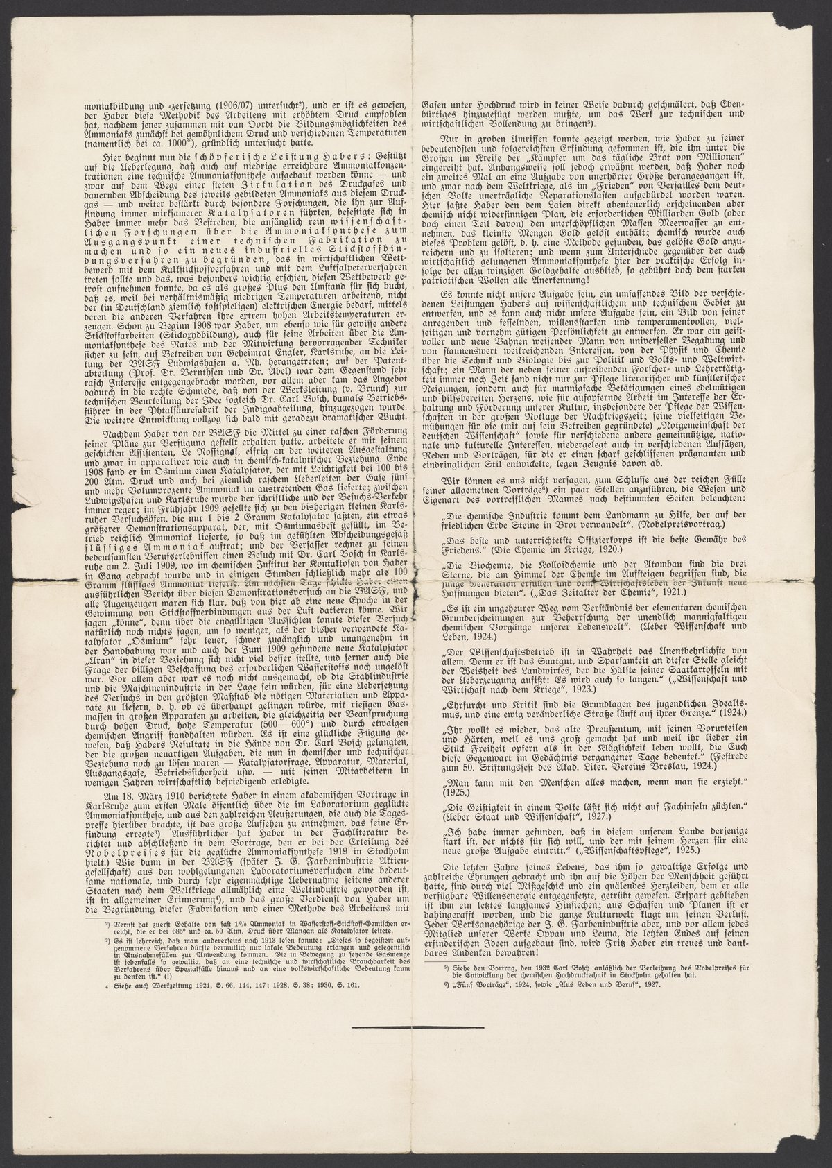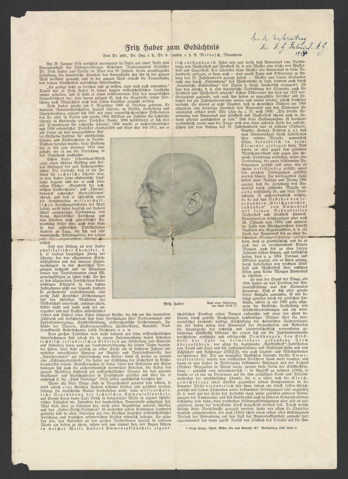 Mittasch, Alwin. “Fritz Haber Zum Gedachtnis.” Interessengemeinschaft Farbenindustrie Aktiengesellschaft, 1934. Papers of Georg and Max Bredig, Box 4, Folder 17. Science History Institute. Philadelphia. https://digital.sciencehistory.org/works/zm2ih5j.