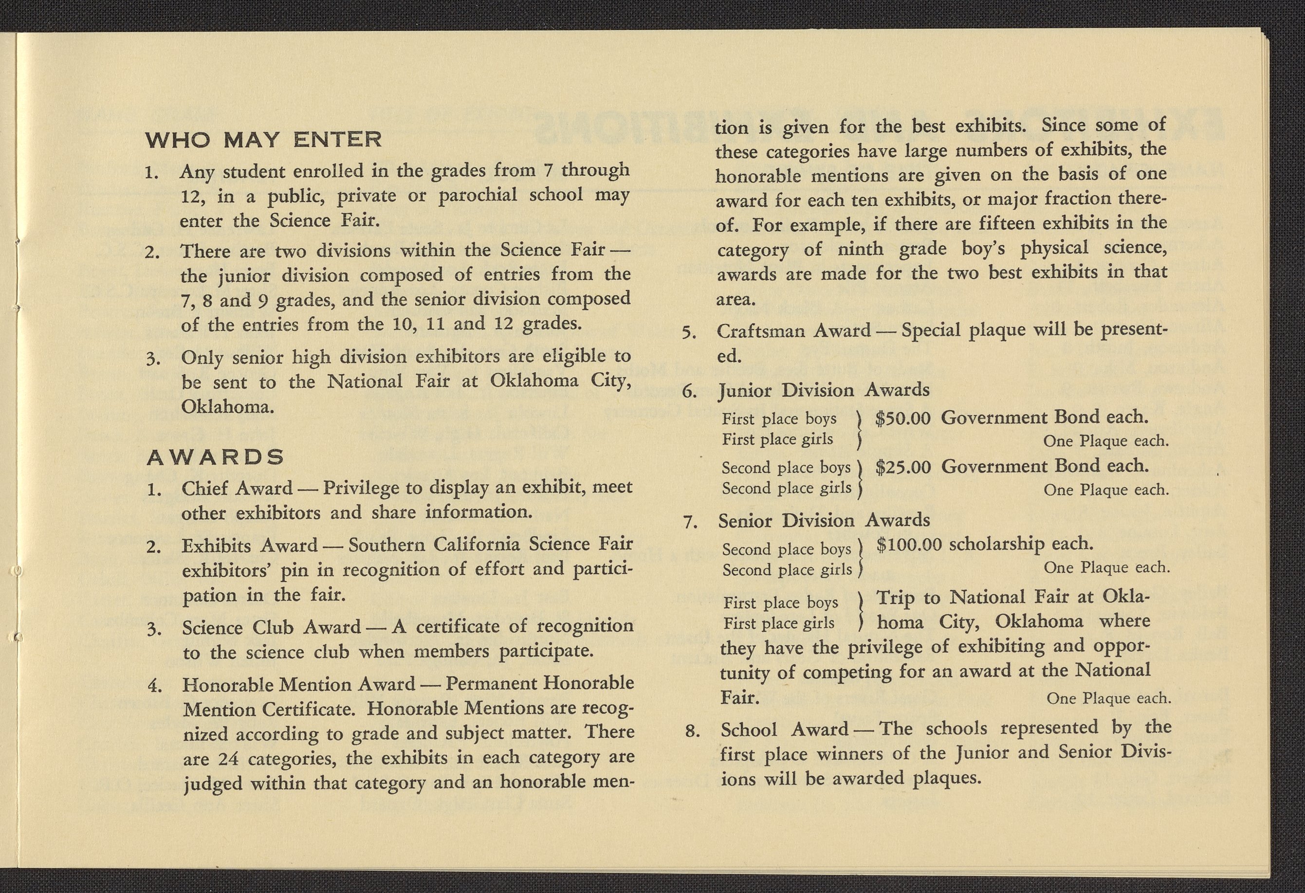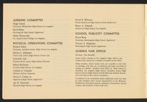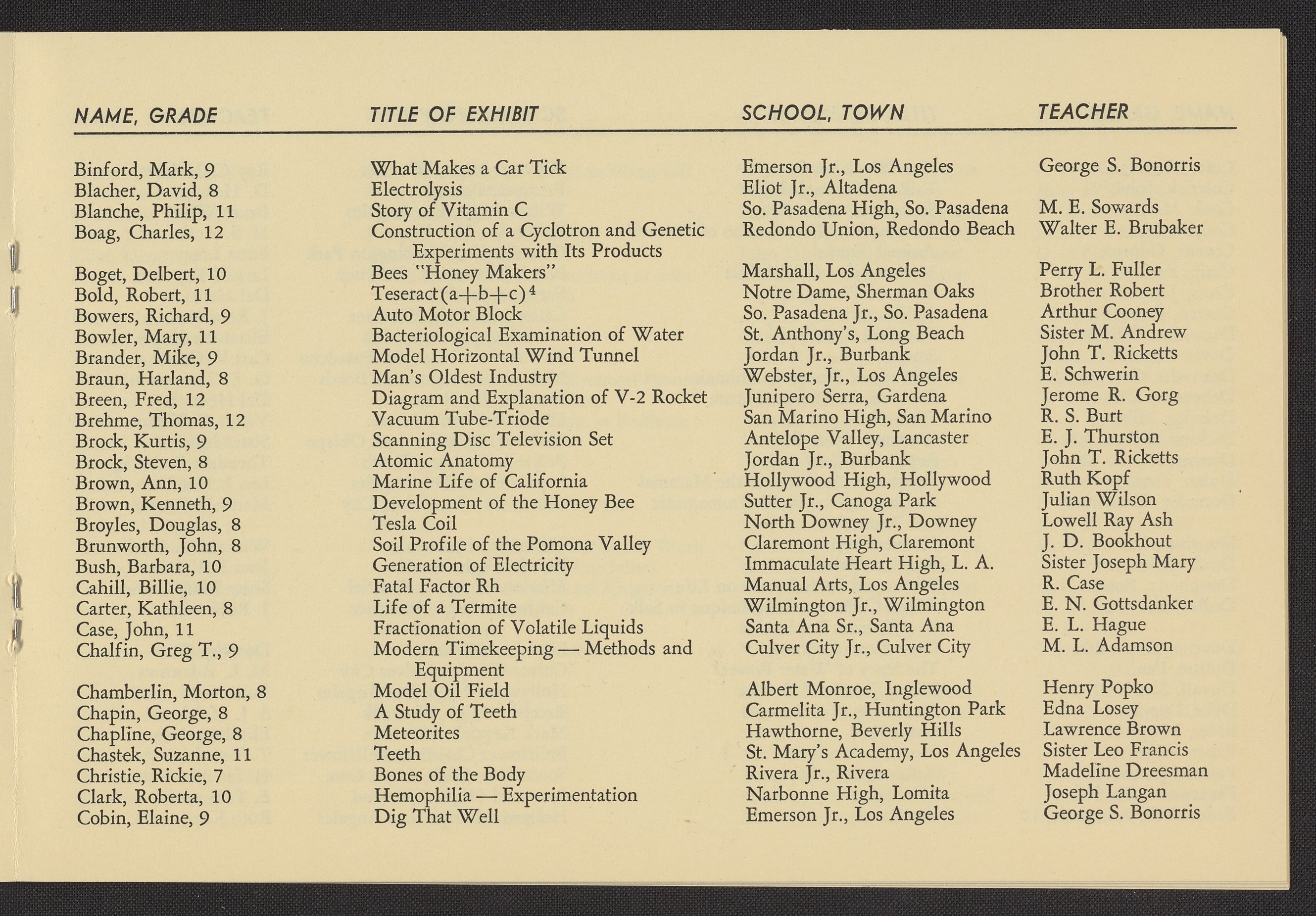 Small JPG1200 x 810px — 159 KBFull-sized JPG2678 x 1808px — 685 KBOriginal fileTIFF — 2678 x 1808px — 13.9 MBThe booklet describes the organization responsible for the Fifth Annual Southern California Science Fair, held in April at the Los Angeles County Museum. A list of student exhibitors includes their name, grade, exhibit title, school, and teacher.