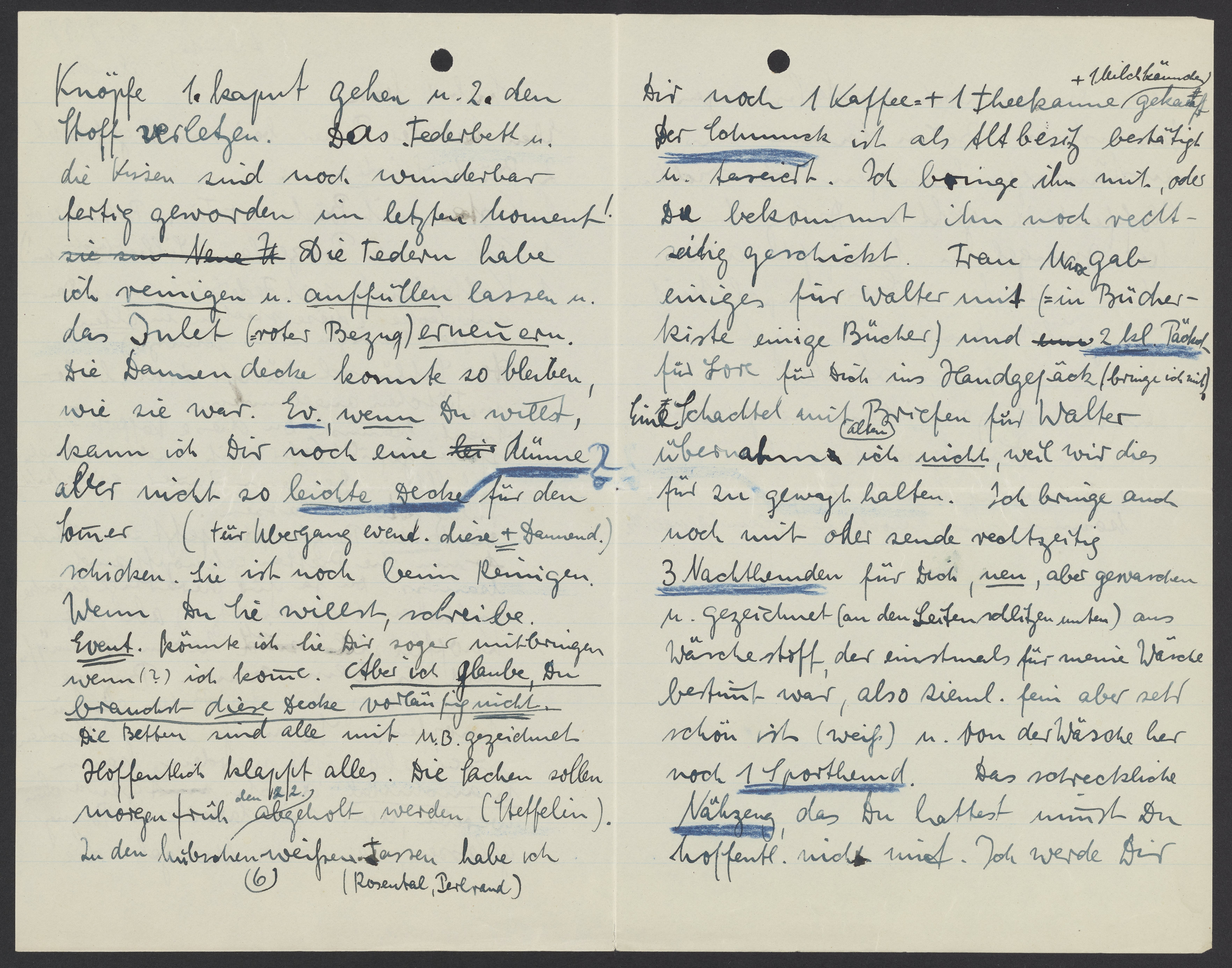Wenn Du sie willst, schreibe. Event. könnte ich sie Dir sogar mitbringen wenn (?) ich komme. Aber ich glaube, Du brauchst diese Decke vorläufig nicht. Die Betten sind alle mit M.B. gekennzeichnet. Hoffentlich klappt alles. Die Sachen sollen morgen früh den 22. abgeholt werden. (Steffelin). Zu den hübschen weißen 6 Tassen (Rosental, Perlrand) habe ich