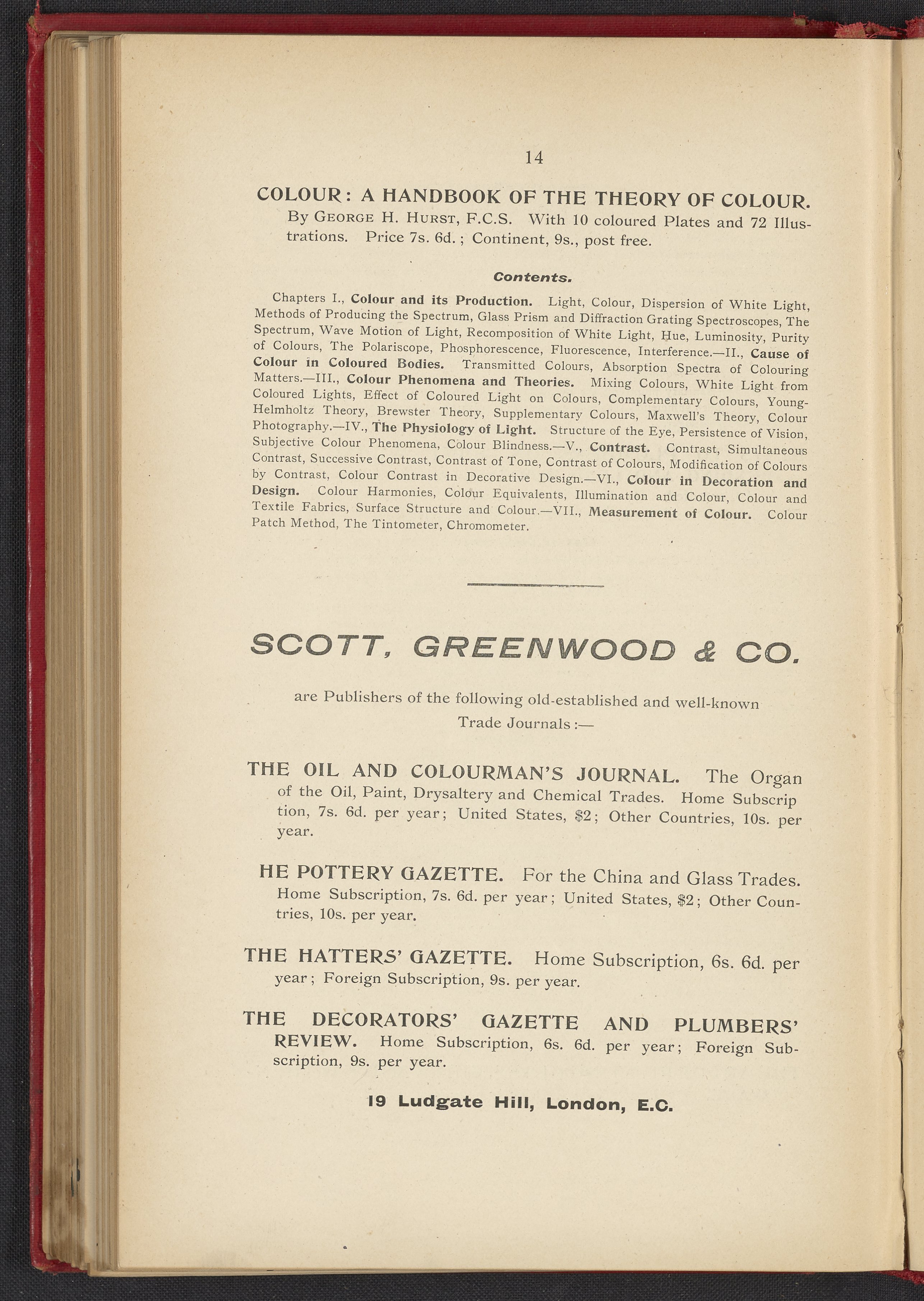 Hurst, George H. (George Henry). “Colour : A Handbook of the Theory of Colour.” London, England: Greenwood Scott, 1900. QC495 .H87 1900. Science History Institute. Philadelphia. https://digital.sciencehistory.org/works/zr8egyw.