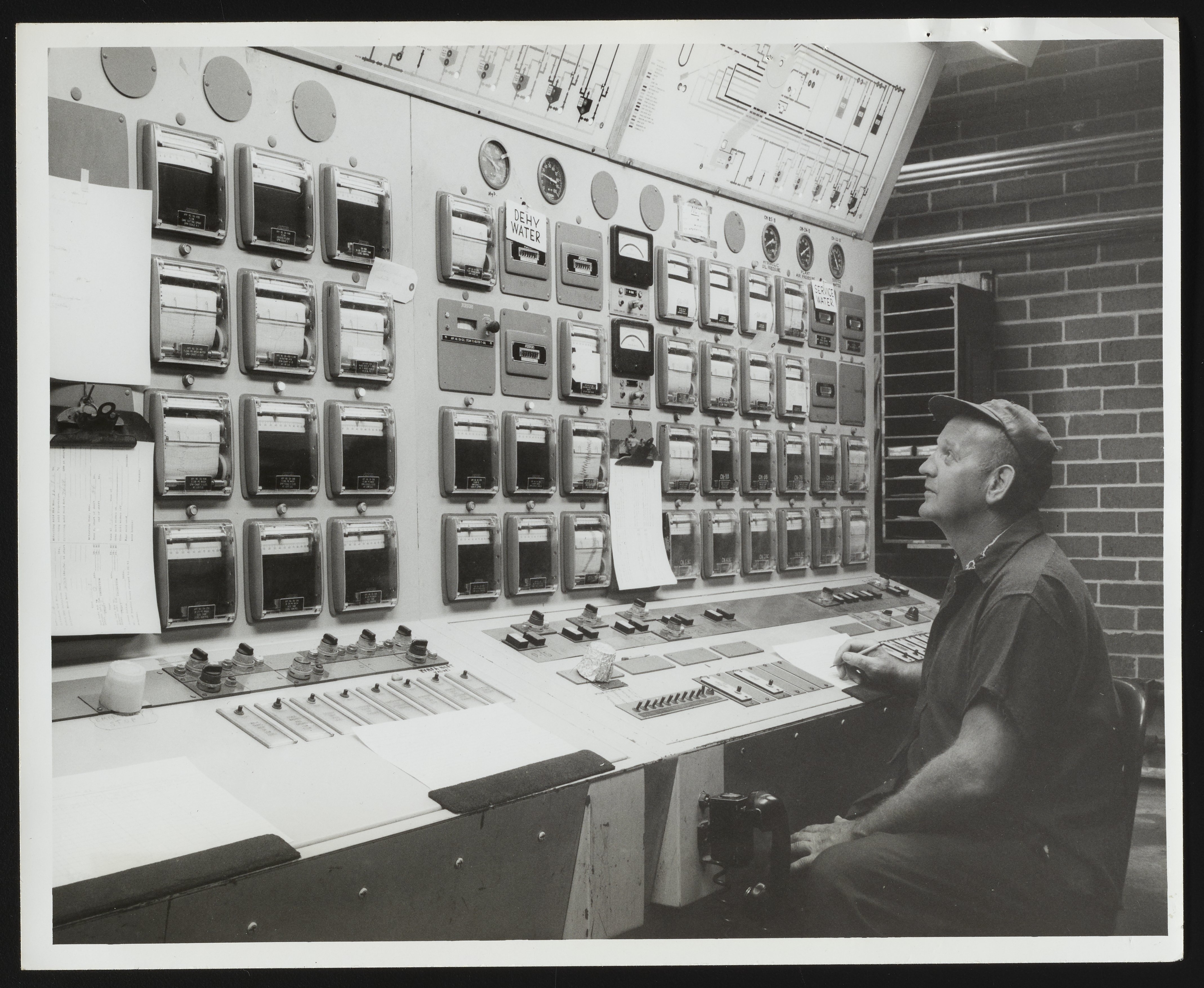 Hercules Incorporated. “ Alfred Buckowski Working at Control Board at Hercules Parlin Plant,” circa 1959. Photographs from the Records & Ephemera of Hercules Incorporated, Box 2, Folder 23. Science History Institute. Philadelphia. https://digital.sciencehistory.org/works/zs25x921q.