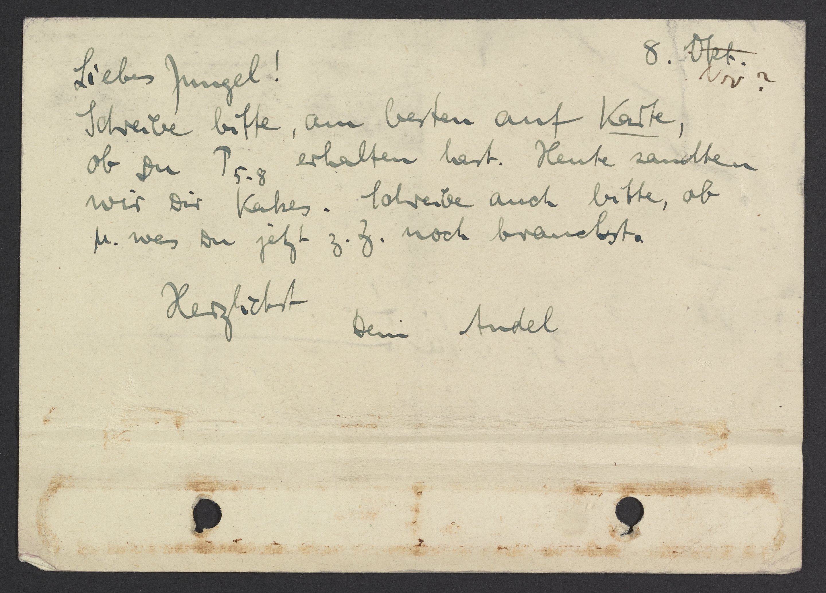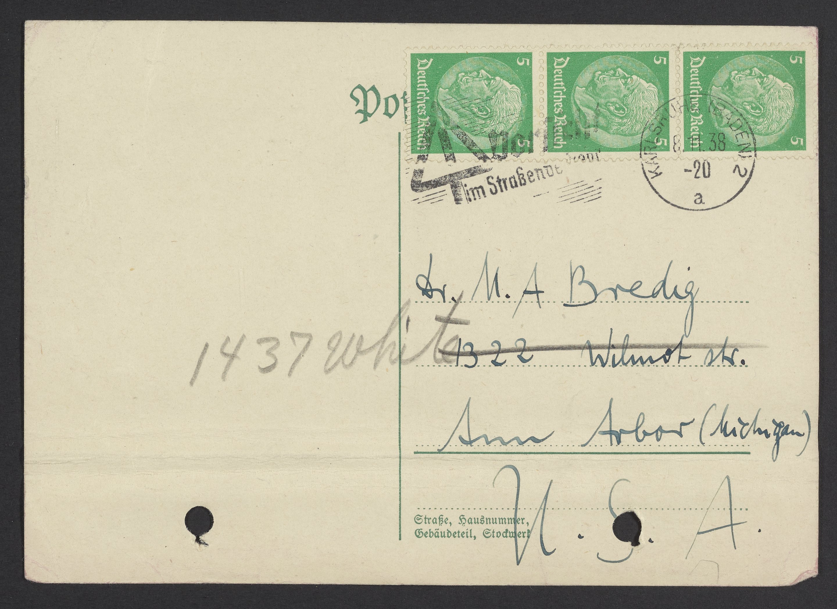 Postcard from Marianne Homburger to Max Bredig, November 8, 1938