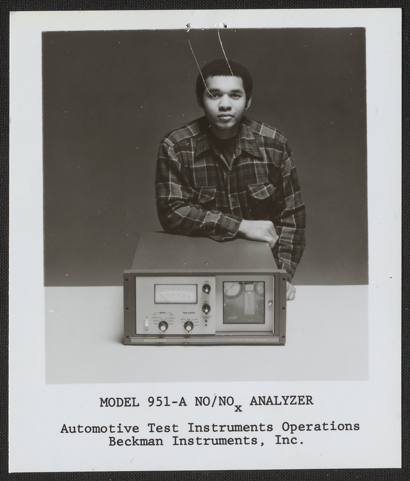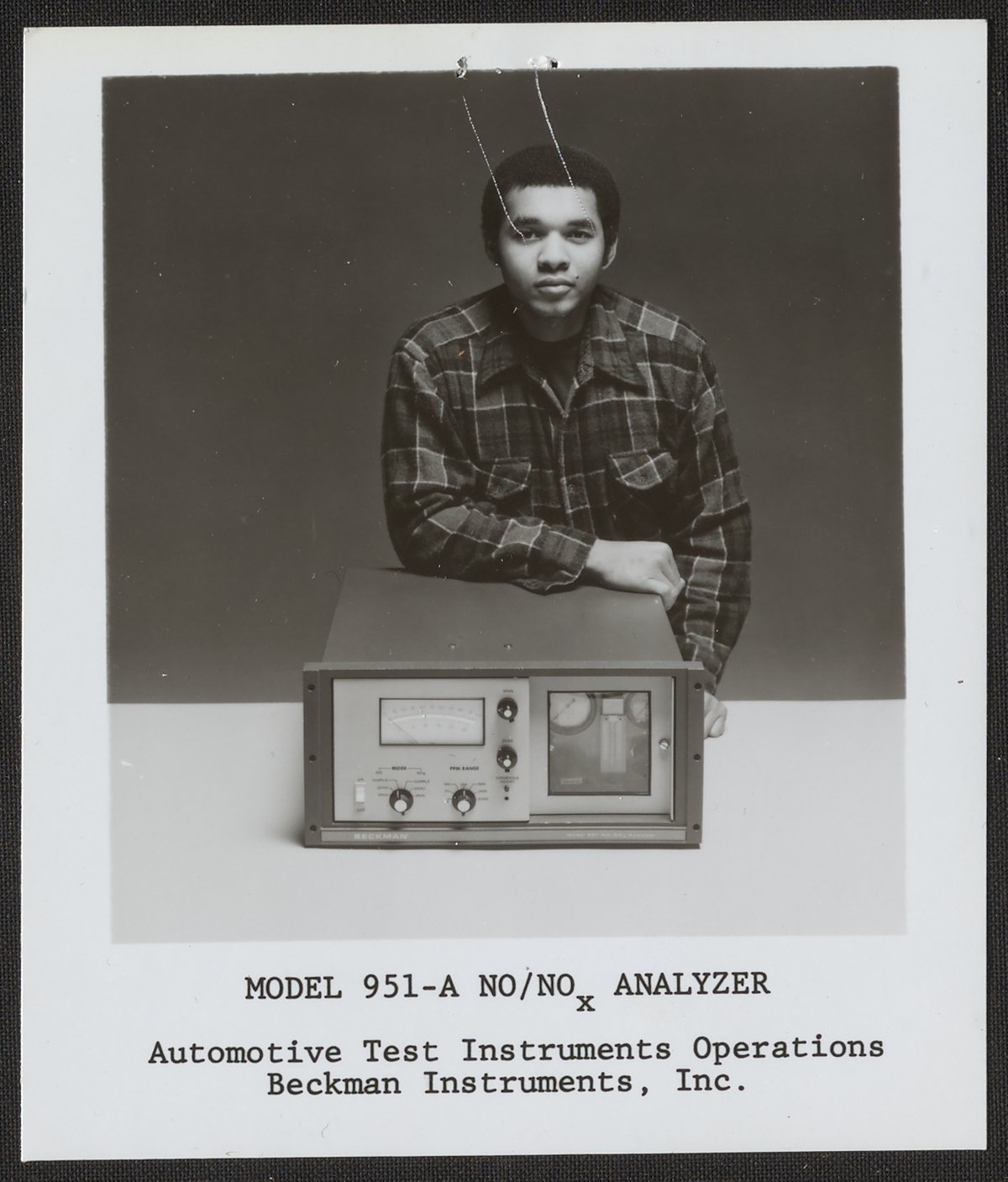 “Man with Beckman Model 951-A NO/NOx Analyzer,” 1970–1979. Beckman Historical Collection, Box 84. Science History Institute. Philadelphia. https://digital.sciencehistory.org/works/zw12z5442.