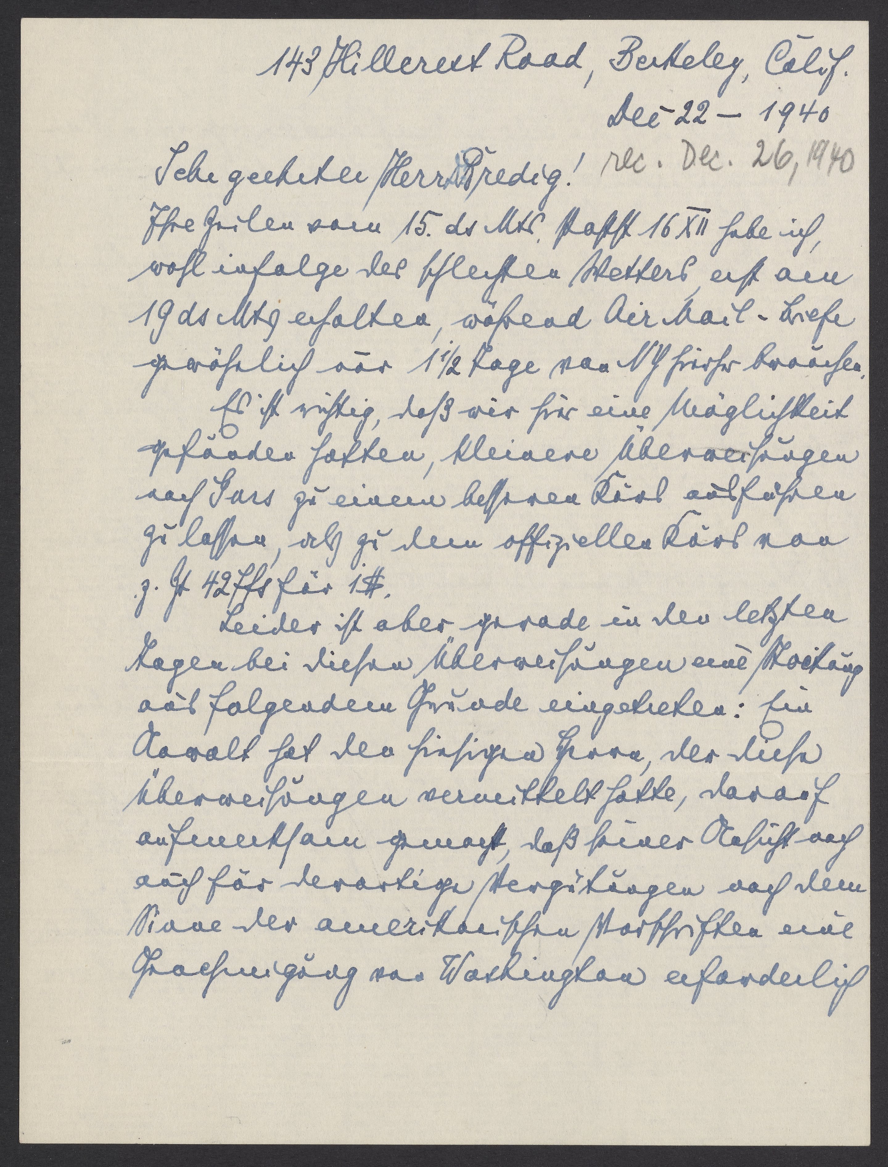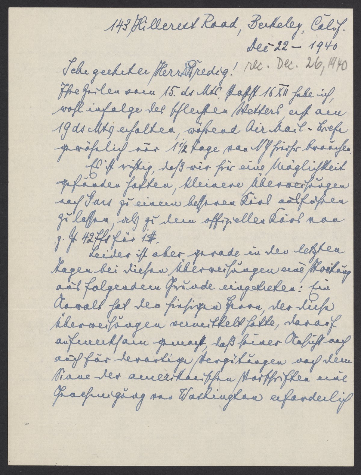 Letter from Dr. Moritz Straus to Max Bredig, December 1940